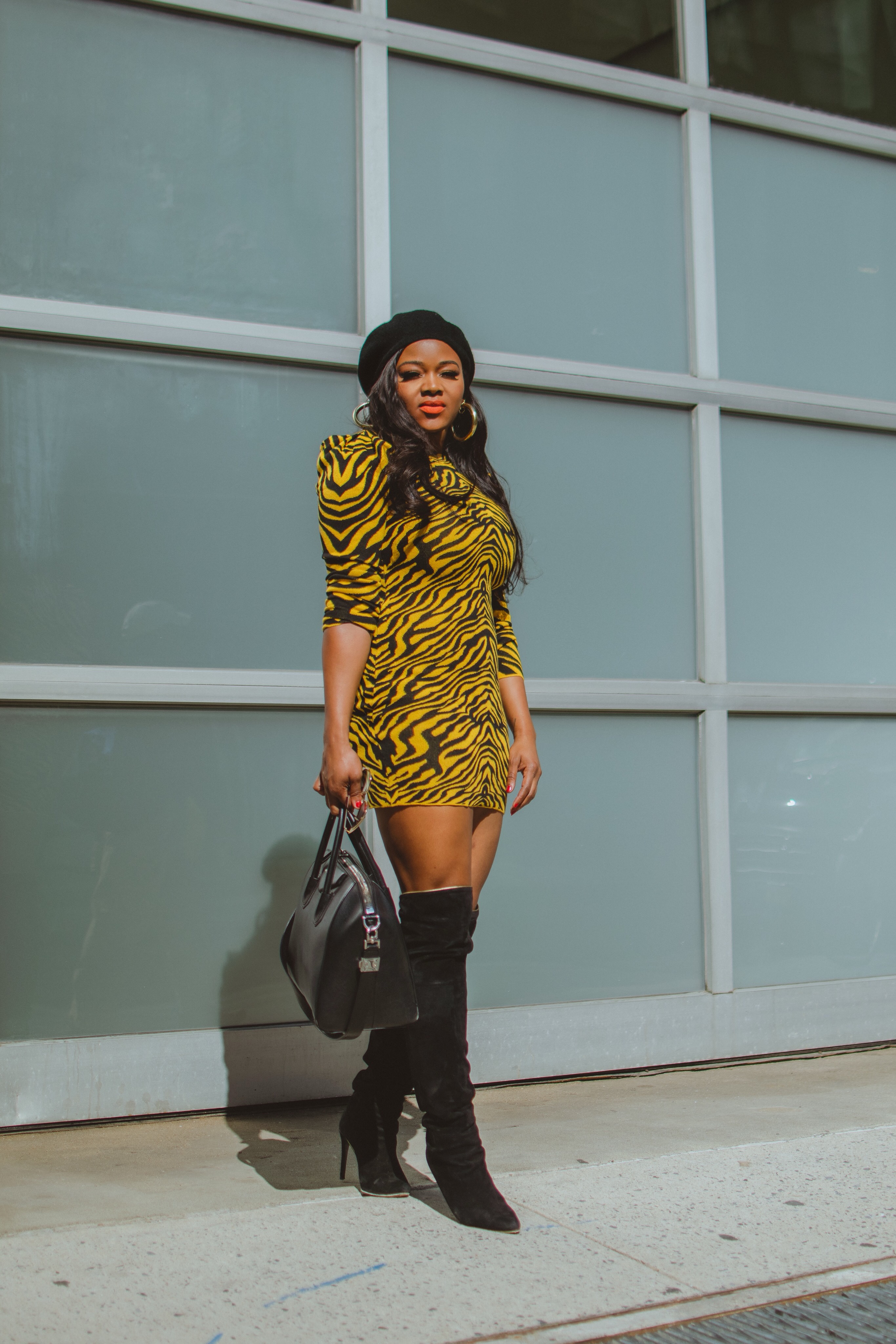 The dress was a statement piece on its own, so I kept my accessories simple with Balmain black thigh high boots, a black Givenchy purse, and a beret (another favorite of mine!).