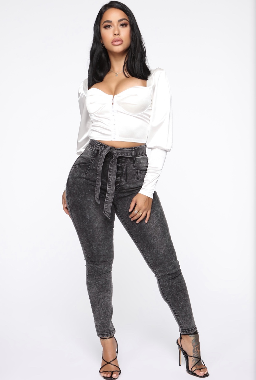 Like mega Bombshell Taina Willaims, Fashion Nova has the kind of styles that you can pair easily with whatever. Rocking her dark denim jeans with Fashion Nova’s ‘Leave You Wanting More’ Crop Top, her look is simple and trendy. Available in black as well with modish details of pleats, puffy sleeve and a polyester texture this top will cost you $30, Bombshells. Find it here!