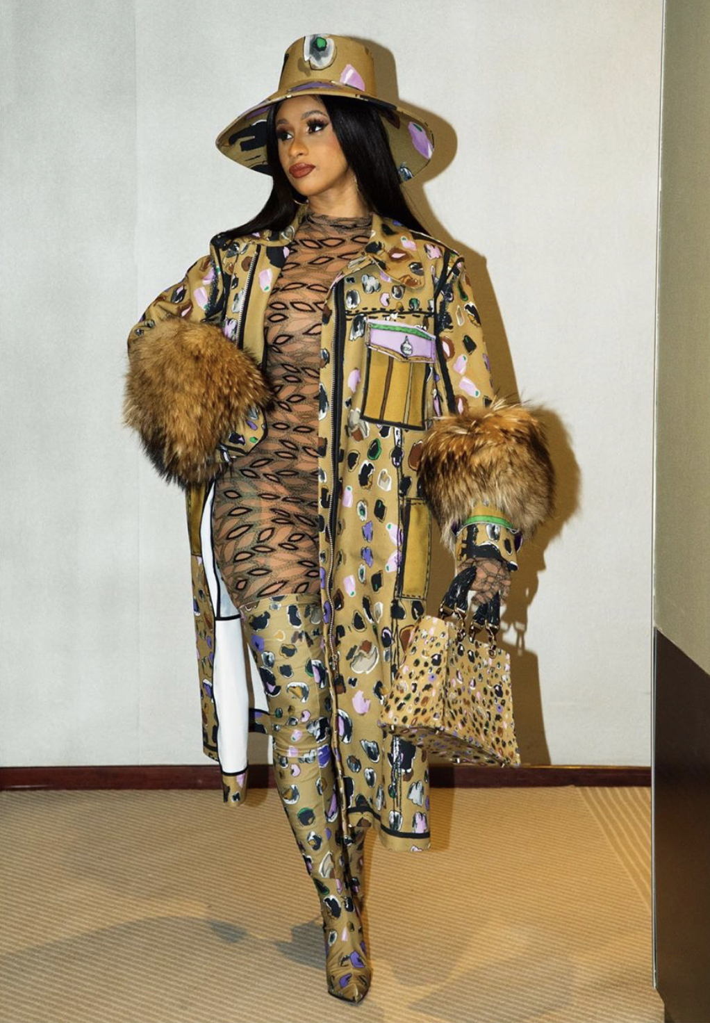 Cardi was spotted in Edda and an Aliétte bodysuit while at Paris Fashion Week.