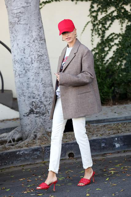 Hailey Beiber paired hers with a trendy oversized blazer and wore a fiery red pair: