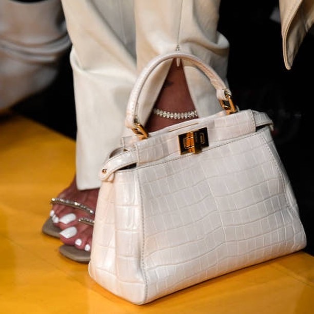 Rihanna wore a cream look featuring an Alexandre Vauthier SS19 Couture leather trench coat with Fenty Pants, Amina Muaddi shoes, and a Fendi bag.