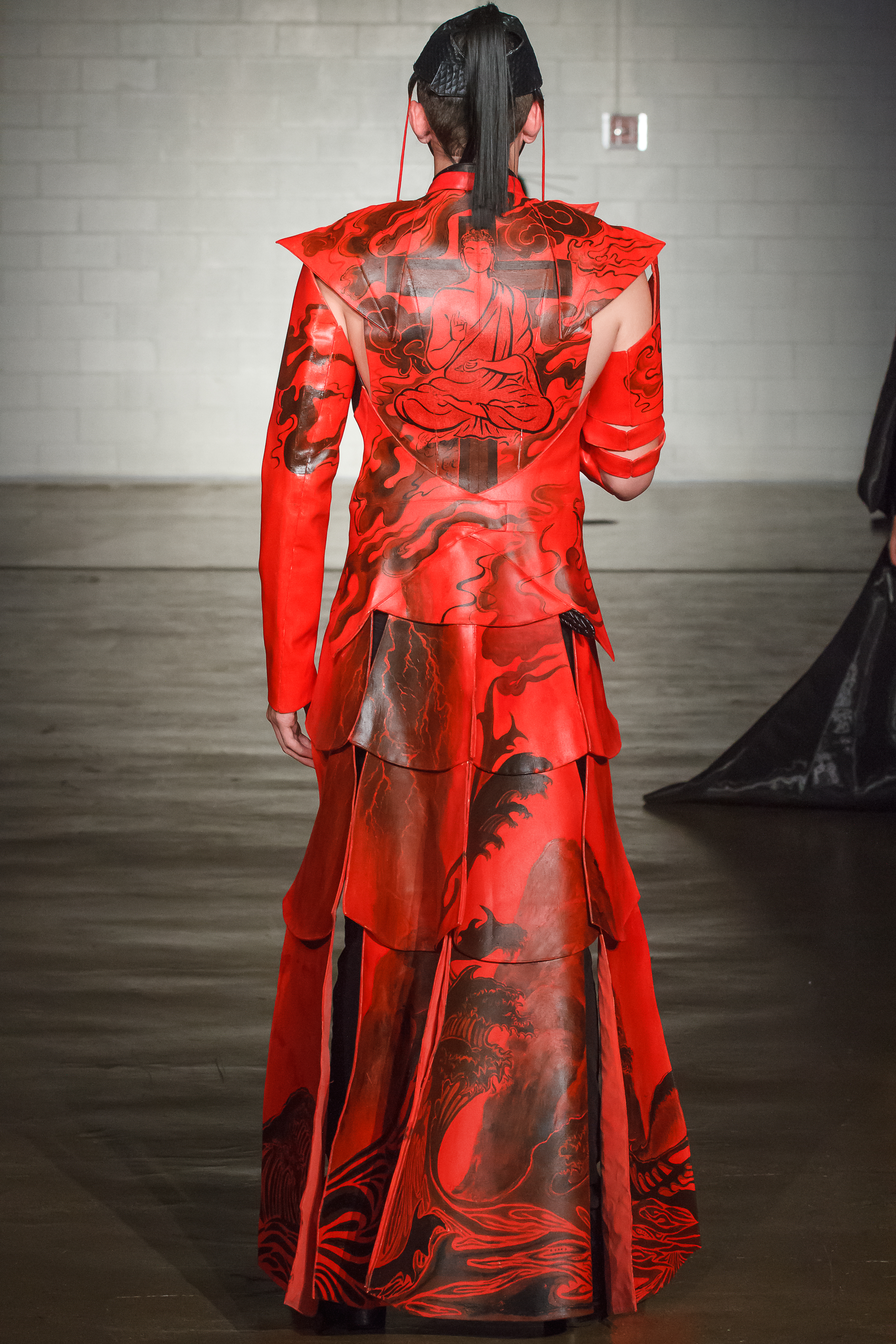 With the general concern surrounding climate change, designers are finding new ways to create unique work, and still promote sustainability in their brand. Alexander King Chen’s couture collection tackled climate change in a future dystopian Japan. Chen’s show notes stated “We must take action for the things we love, before we run out of time,” a jarring metaphor about saving Mother Earth. Hand-painted vinyl jackets and gowns created a dismal scene of a future Japan destroyed by unaddressed issues relating to climate change.