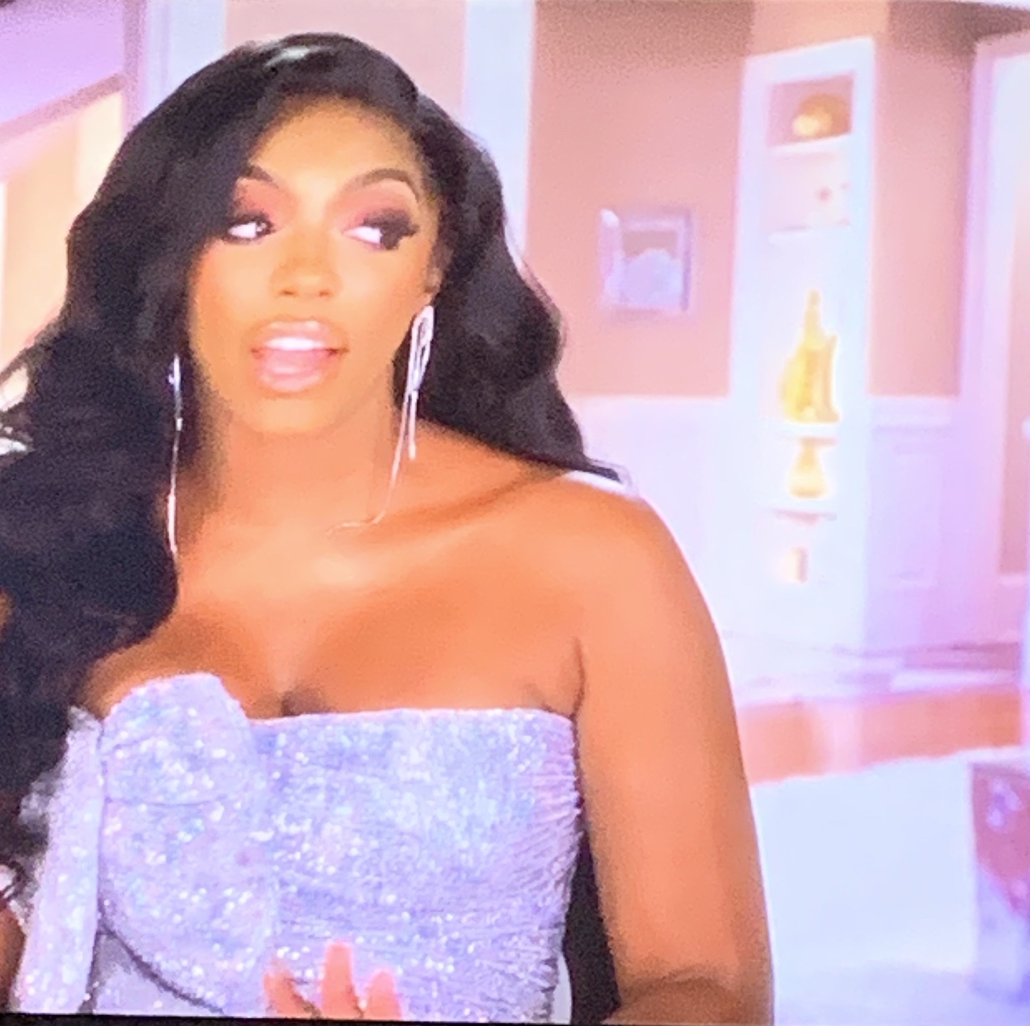 Porsha looks pretty in a confessional in a $225 House of CB Holographic Strapless dress.