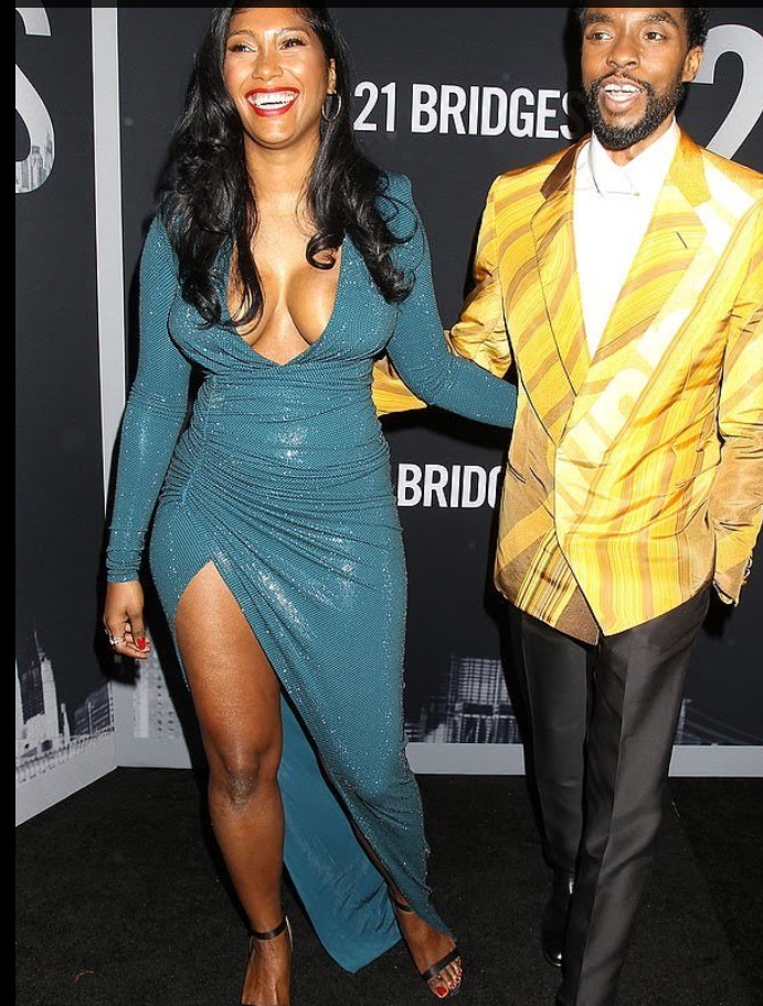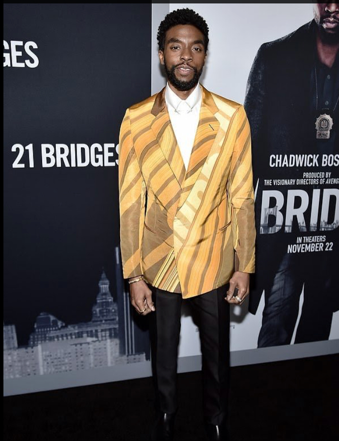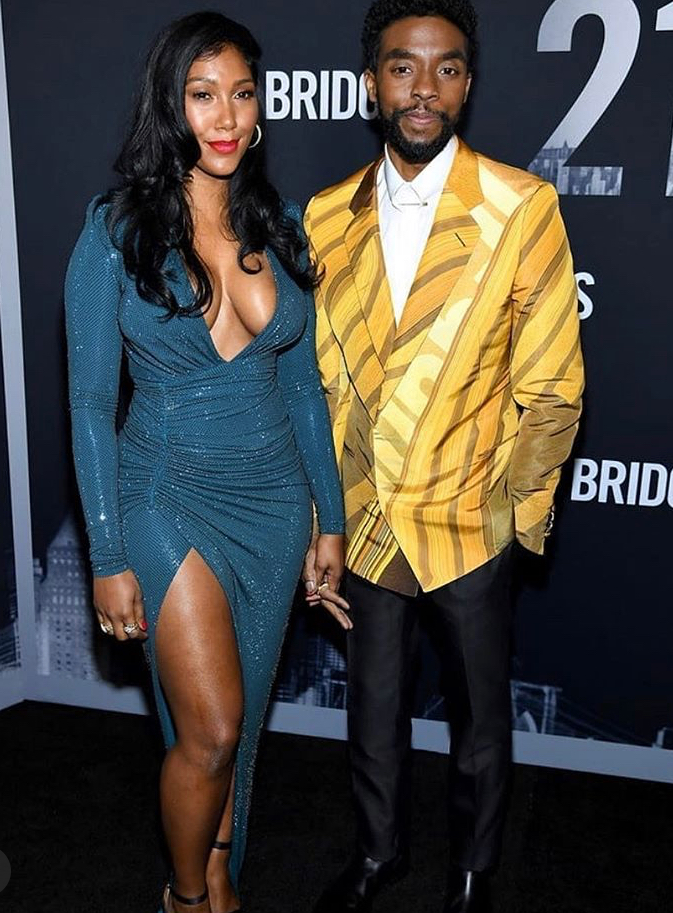 Chadwick’s fashion sense and ensembles never disappoint. He wore a bold yellow patterned strategically cut blazer by designer Alfred Dunhill over a white crisp shirt with black fitted pants to the premiere. The Black Panther star’s finished look included black patent leather shoes. His lovely lady wore a daring turquoise low cut, long dress with a high slit and strappy black heels. They both looked amazing.