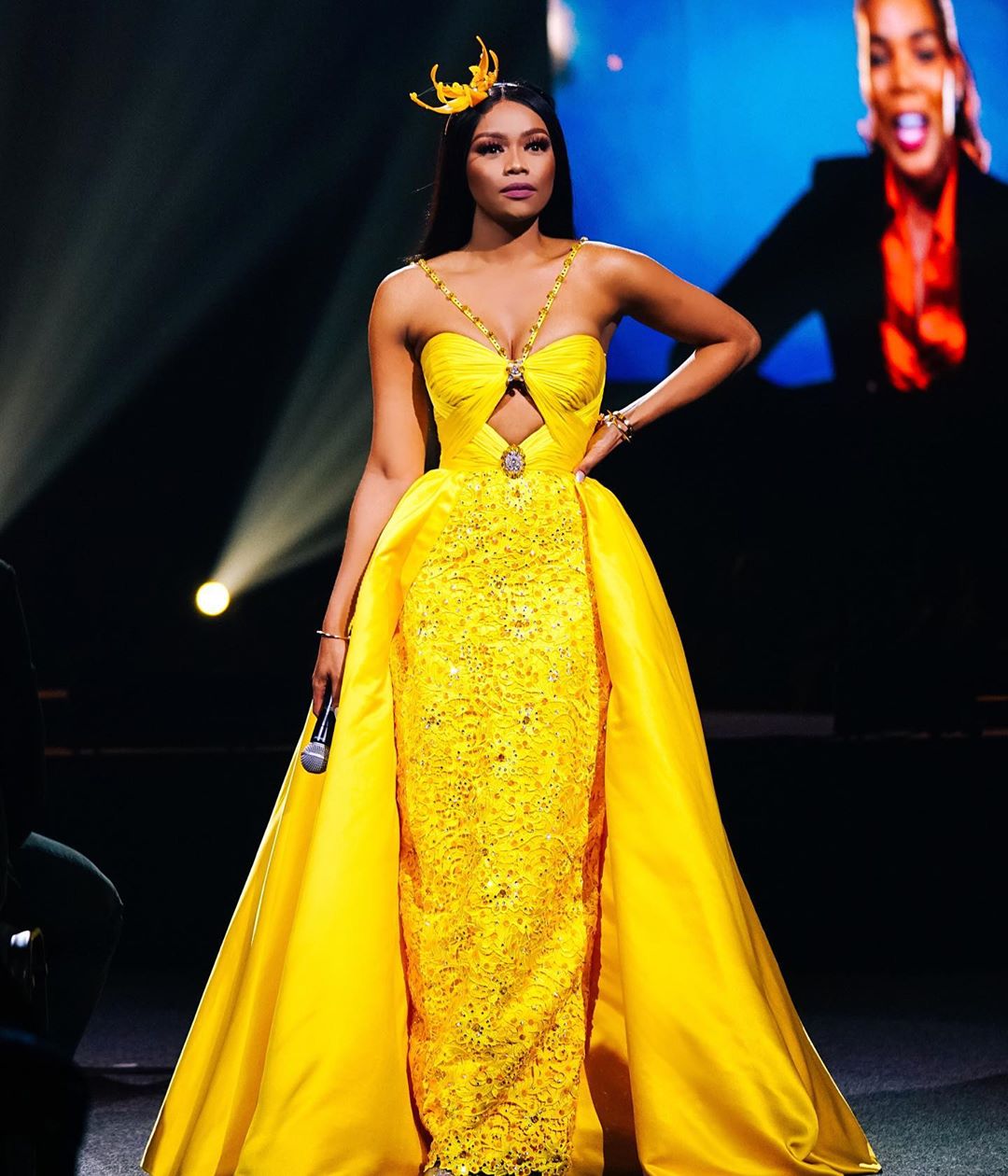 The television personality and host shone brightly at the 2019 Miss South Africa pageant in a mustard yellow gown by the designer.