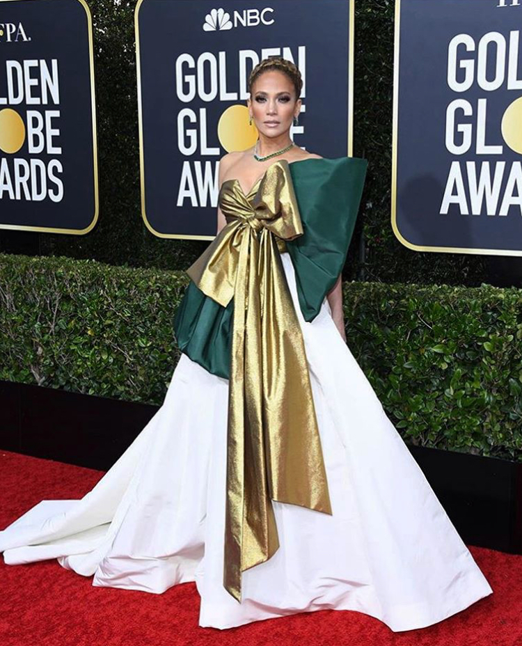 Jennifer Lopez took to the 2020 Golden Globes red carpet in her usual unforgettable look. The mega star wore an impeccable gold and white Valentino ball gown adoring two huge gold and emerald bows on the front to the award show. Her hair was pinned up into a neat oversized bun, in a crown like style of goddess braids. Her accessories included emerald and diamond jewels and a matching clutch. What do you think of the star’s ensemble?