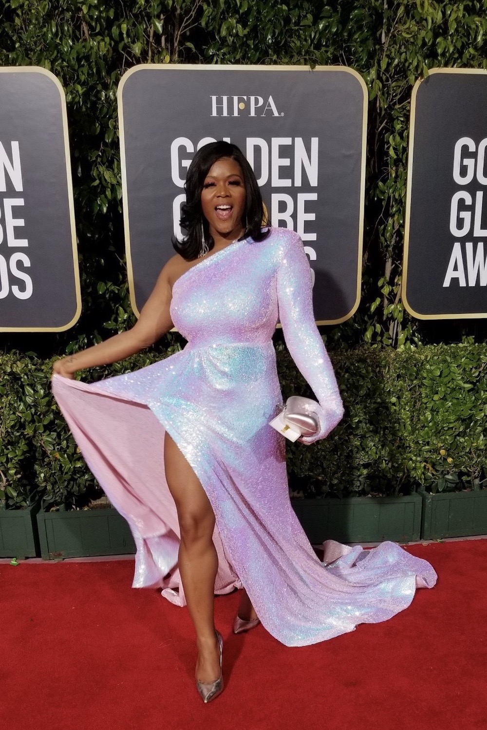 The Editor in Chief of BeautyLifeFun, diva Claire Sulmers attended the Golden Globes as a special guest of Moët & Chandon. The Queen of online fashion and style wore a one of a kind extraordinary iridescent sequin one shoulder dress by designer Bahamian designer Valentino Omar, complete with a long glove and matching accessories. The look was a show stopper on the red carpet. What say you about the look?