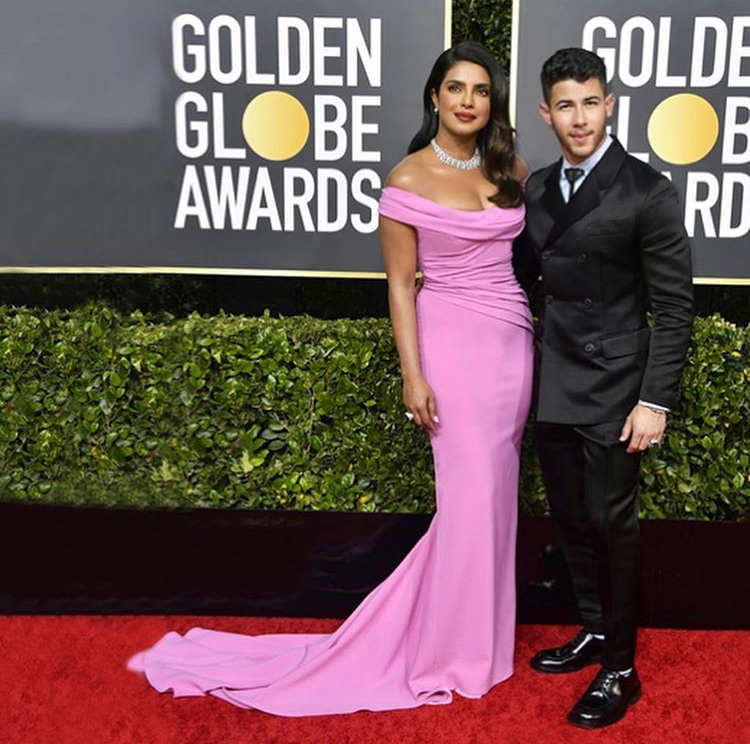 The beyond stunning “Bollywood” actress Priyanka Chopra turned heads at the 2020 Golden Globes with her handsome hubby by her side, pop sensation Nick Jonas in Prada. Chopra wore a rose pink impeccably fit, floor length gown by Cristina Ottaviano, her striking jewels by Bulgari, & styled by Mimi Cuttrell. What do you say about the couple’s fashion statement?