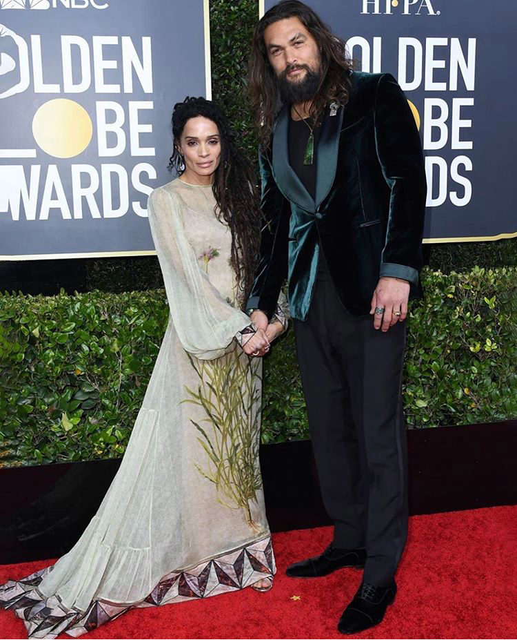 Some couples can’t help but to make an entrance, like Lisa Bonet & Jason Momoa at the 2020 Golden Globes. Momoa wore an emerald green Tom Ford jacket and slim black slacks. His ageless & gorgeous wife, “Lilakoi Moon” noted from Fendi’s Instagram page of Bonet’s attire, wore a Fendi pale green draped dress with palm leaf accents. Their presence is always felt. Bonet is a veteran actress herself and considered a leading lady and television sweetheart of the 90’s. What’s your take on their style?