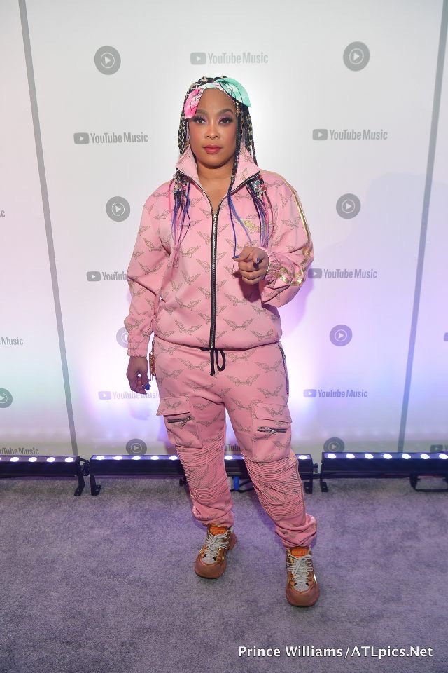 Da Brat wore a powder pink logo printed Robin’s Jeans track suit with gold detailing. She wore a pink and orange sneaker by Gucci, and in true Brat fashion, her hair was braided and she wore a dual colored pink and bandana.
