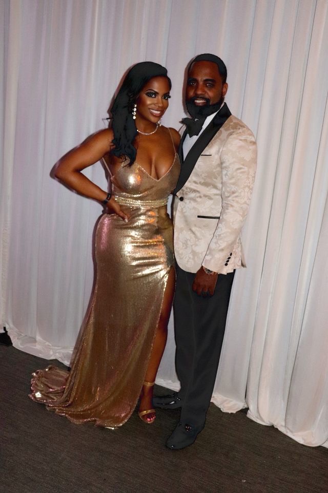 Tiny Harris wore a short, strapless, royal blue dress by Jay Godfrey. The “High Low” dress with extended train highlighted her Gianvito Rossi stiletto sandals.Monica graced the ball wearing a beautiful all white long sleeved gown by Alex Perry. Monica’s hair, a symmetrical blunt cut bob, complimented the perfectly draped, shoulder padded dress. Monica’s white fur is by Duckie Confetti and her shoes are Alexandre BirmanKandi Burruss was dipped in a gold! She wore a floor length gold sequin gown by Macdugal paired with a gold Louboutin sandal. She is shown standing next to her husband Todd=