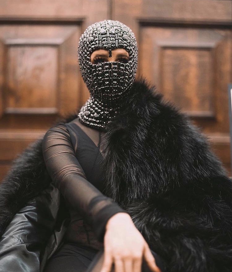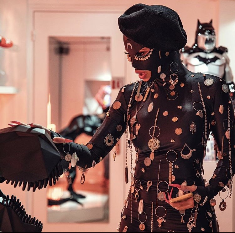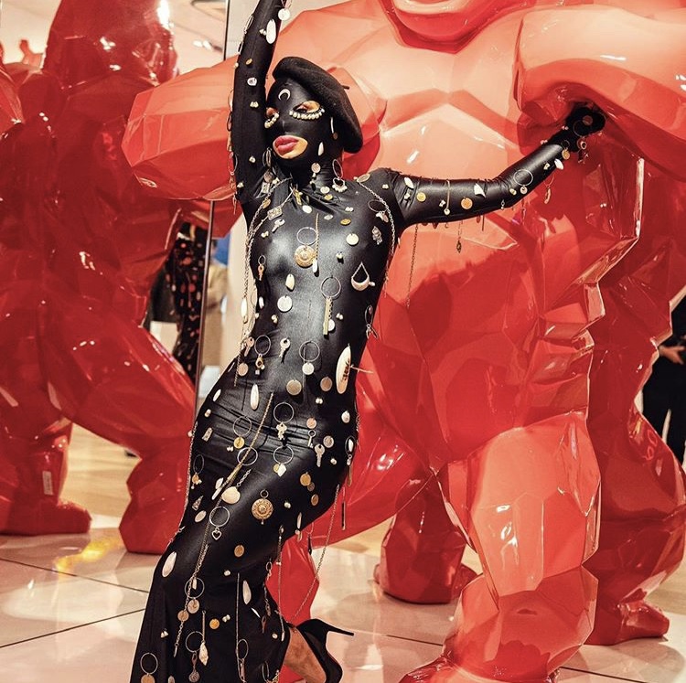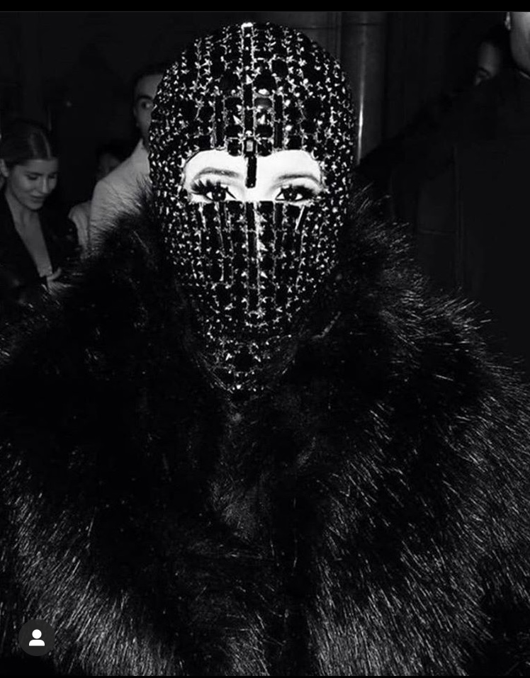 Even a stop to see Richard Orlisnki’s museum requires an extravagant ensemble. This time it’s by Marine Serra. With dangling gold chains and coin like medallions everywhere you would think the designer would stop there. What motivated Marine to add the mask? We don’t know but we are here for it!