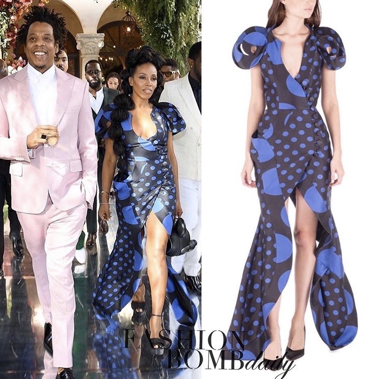 June Ambrose strutted in a black and blue polka dotted pattern dress with a rear and frontal slits by Ronald Van Der Kemp.