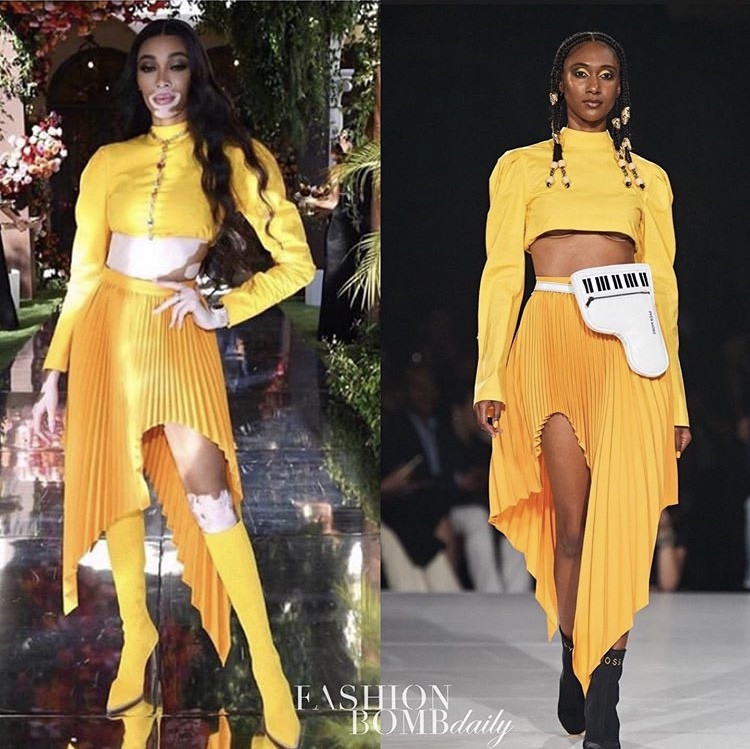 Winnie Harlow shined bright in a yellow ensemble by Pyre Moss. The mustard yellow skirt was a pleated and asymmetrical while the top was long sleeved yellow crop top.