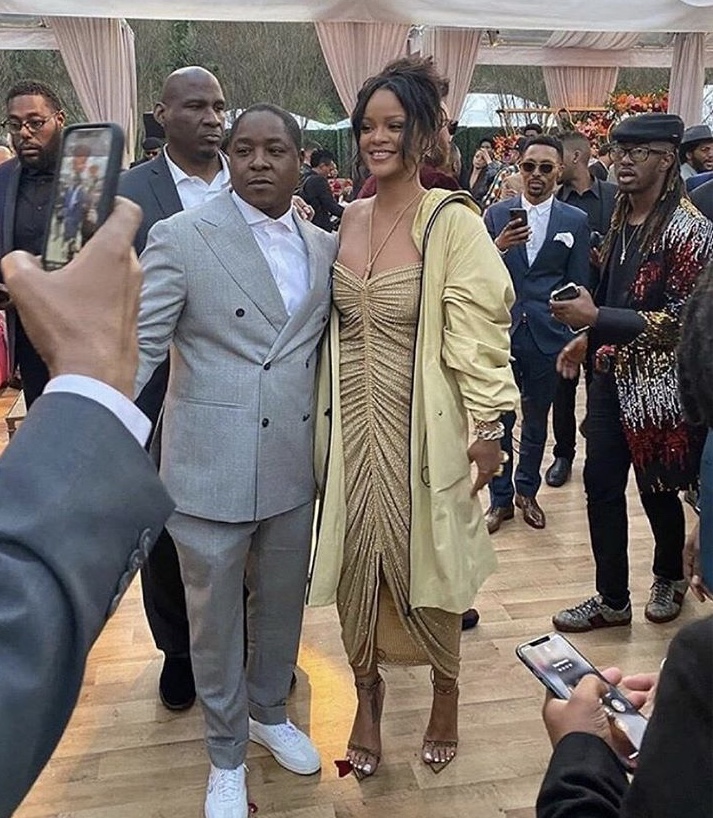 Bad gyal Rihanna showed up wearing Bottega Venta. The textured sequin dress had ruching and was paired with custom Gianvito Rossi sandals.