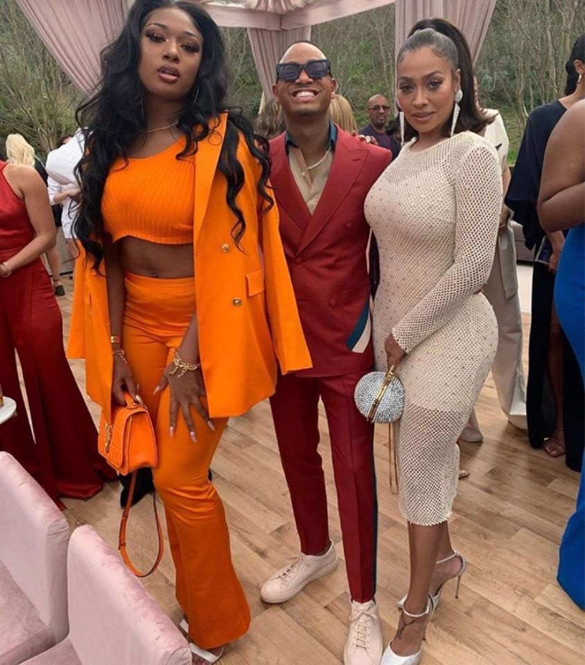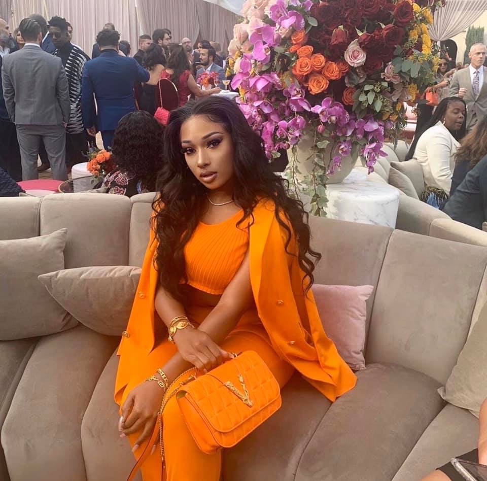 Hot girl Meg Thee Stallion wore an orange Versace suit with matching bag. The blazer was worn open showing off the orange crop top and was accessorized with gold jewelry.