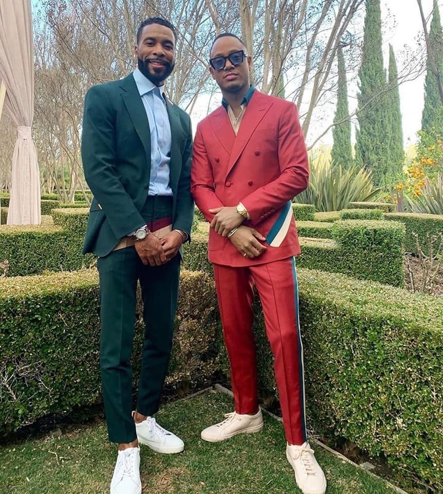 Terrance J wore a deep red suit by Rich Fresh. It has a green and tan stripe down the pant legs and the same detailing is also on the jacket.