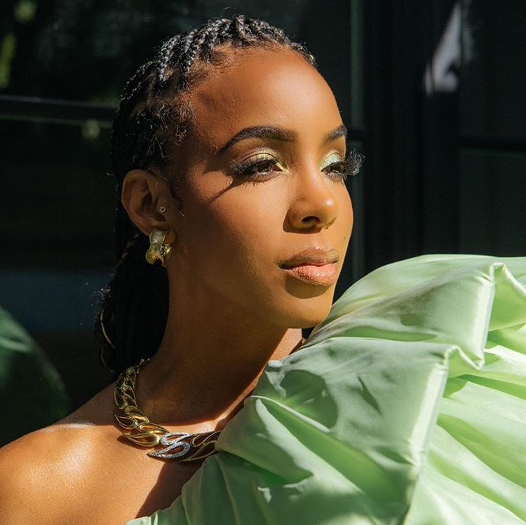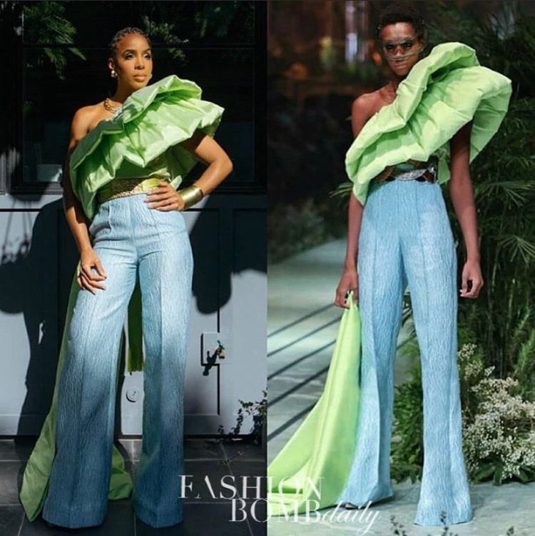Kelly Rowland wore Sebastian Gunawan. The top has lots of volume and was one sleeved. The light green top also had a train and was paired with a bell bottom pant.
