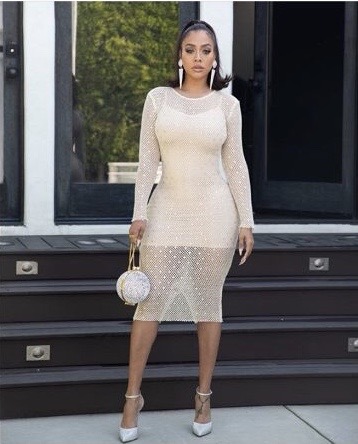 Lala Anthony wore a taupe, embellished, fishnet fitted dress by Sally Lapointe paired with Rene Caovilla heels. Her “crystal orb” bag by Marzook.