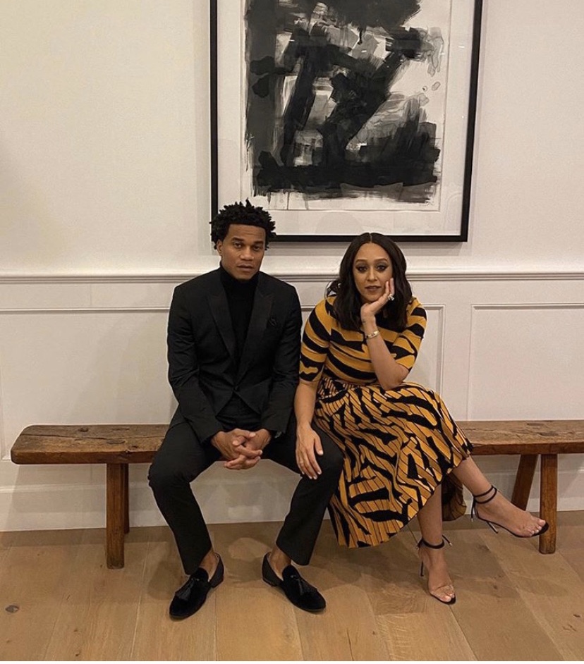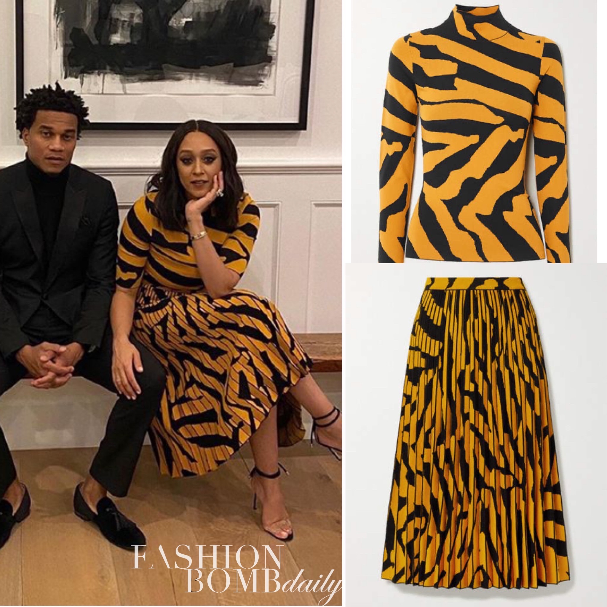 Tia Mowry posed with hubby Cory Hardrict in a $790 Proenza Schouler printed sweater and $890 matching skirt.