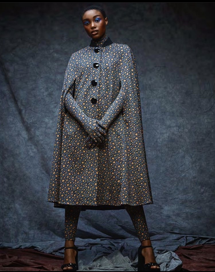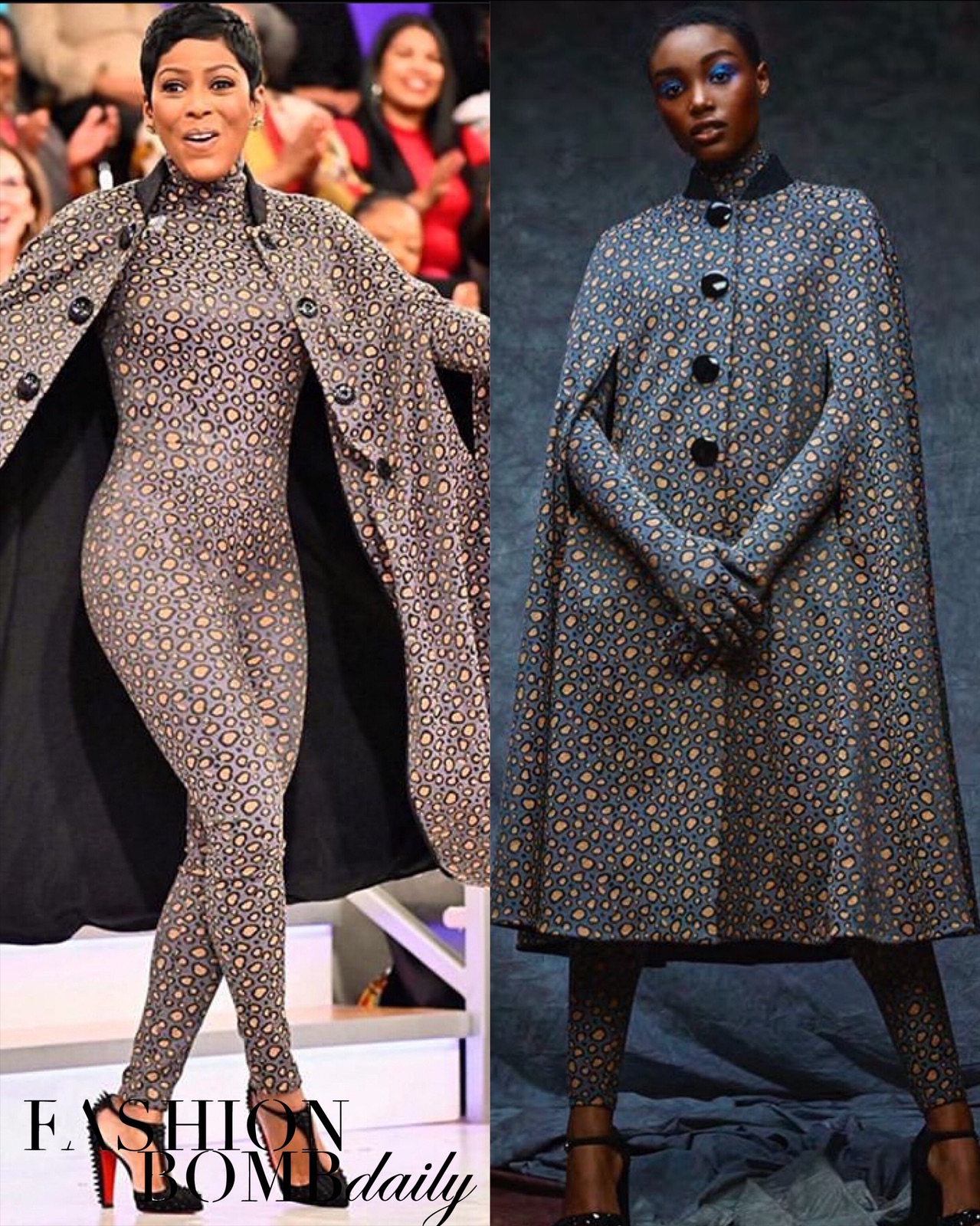 Tamron wore a space grey cat suit with mustard yellow leopard spots by David De La Cruz. This ensemble has a matching cape that has black buttons down the front and a black collar.