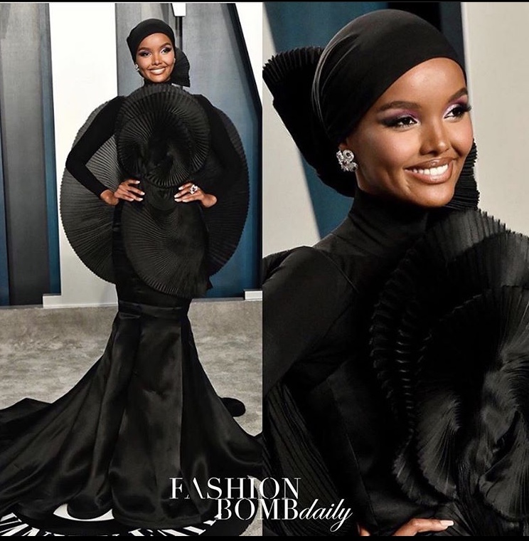 6. Halima Aden wore a black mermaid dress with matching headpiece by Fang. It has 3D pleated circles on the bodice and head wrap.