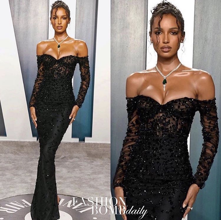 9. Jasmine Tooks wore an off the shoulder black embellished dress by Georges Hobeika.