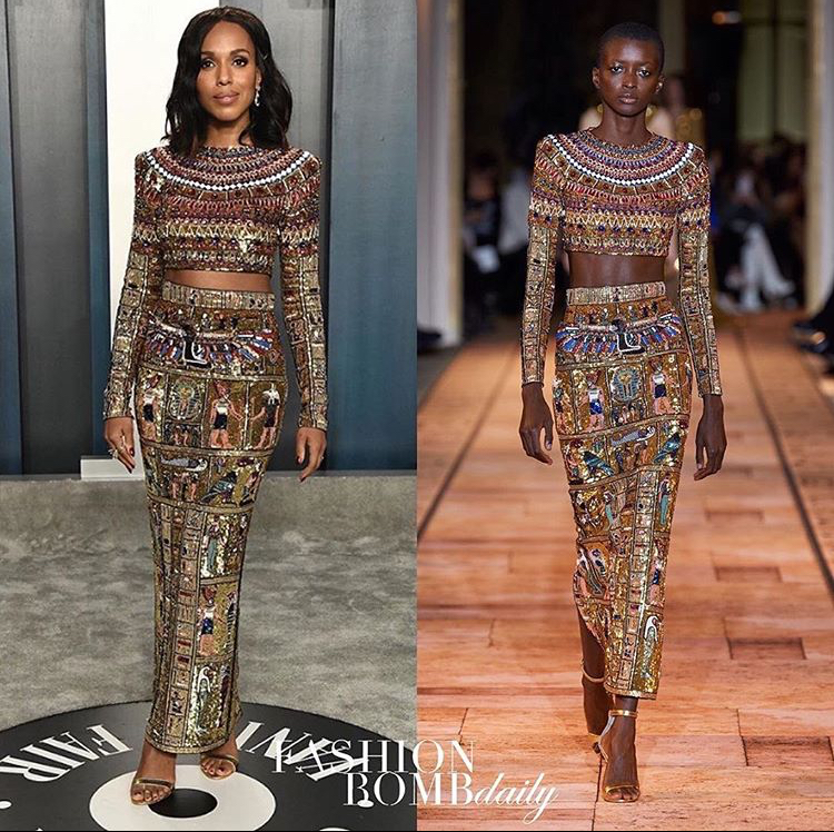 3. Kerry Washington is third in a multi colored tribal print 2 piece by Zuhair Murad. The base color is gold, and the top is a long sleeved crop.