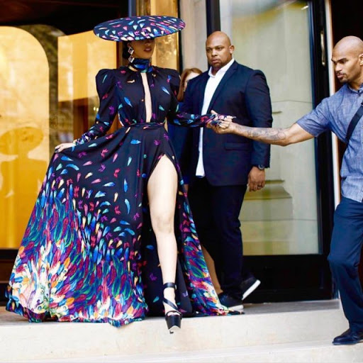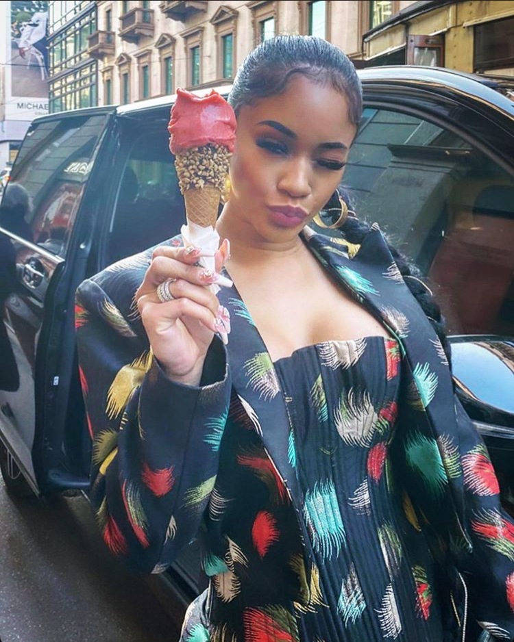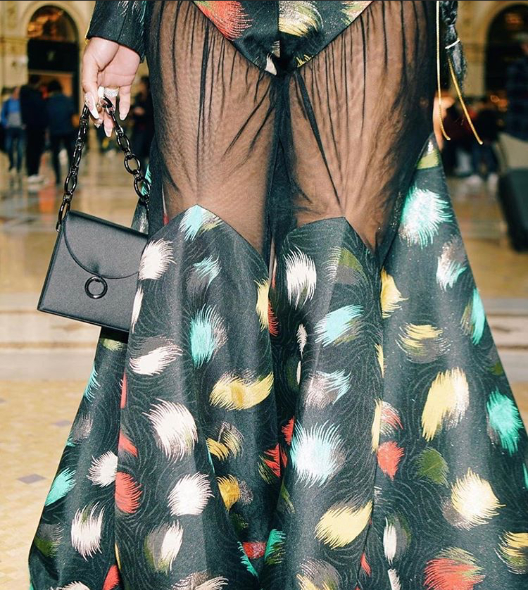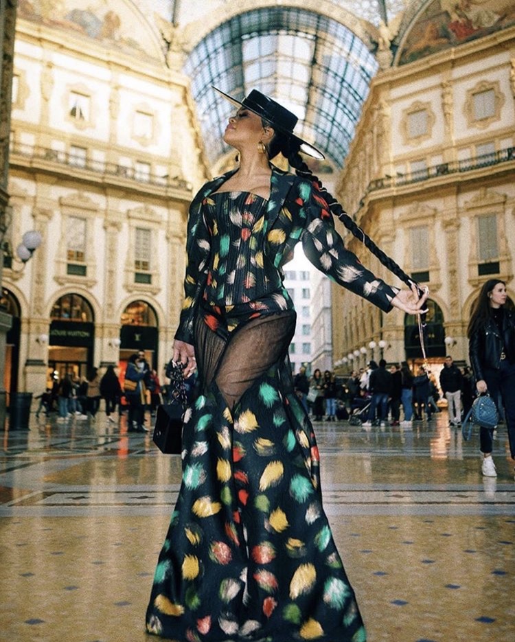 This year in Europe Saweetie stepped out in a teal orange and yellow feather printed ensemble by Harry Halim. Although the silhouettes are similar there are many differences. The bodice on Saweetie’s ensemble is corseted with a tux jacket worn over it. The skirt is actually not a skirt, they are Halim’s signature “trousers gown”! Black sheer starts at the waist, and the pattern begins above the knees. She also accessorized with a large brim hat, styled by Bryon Javar.