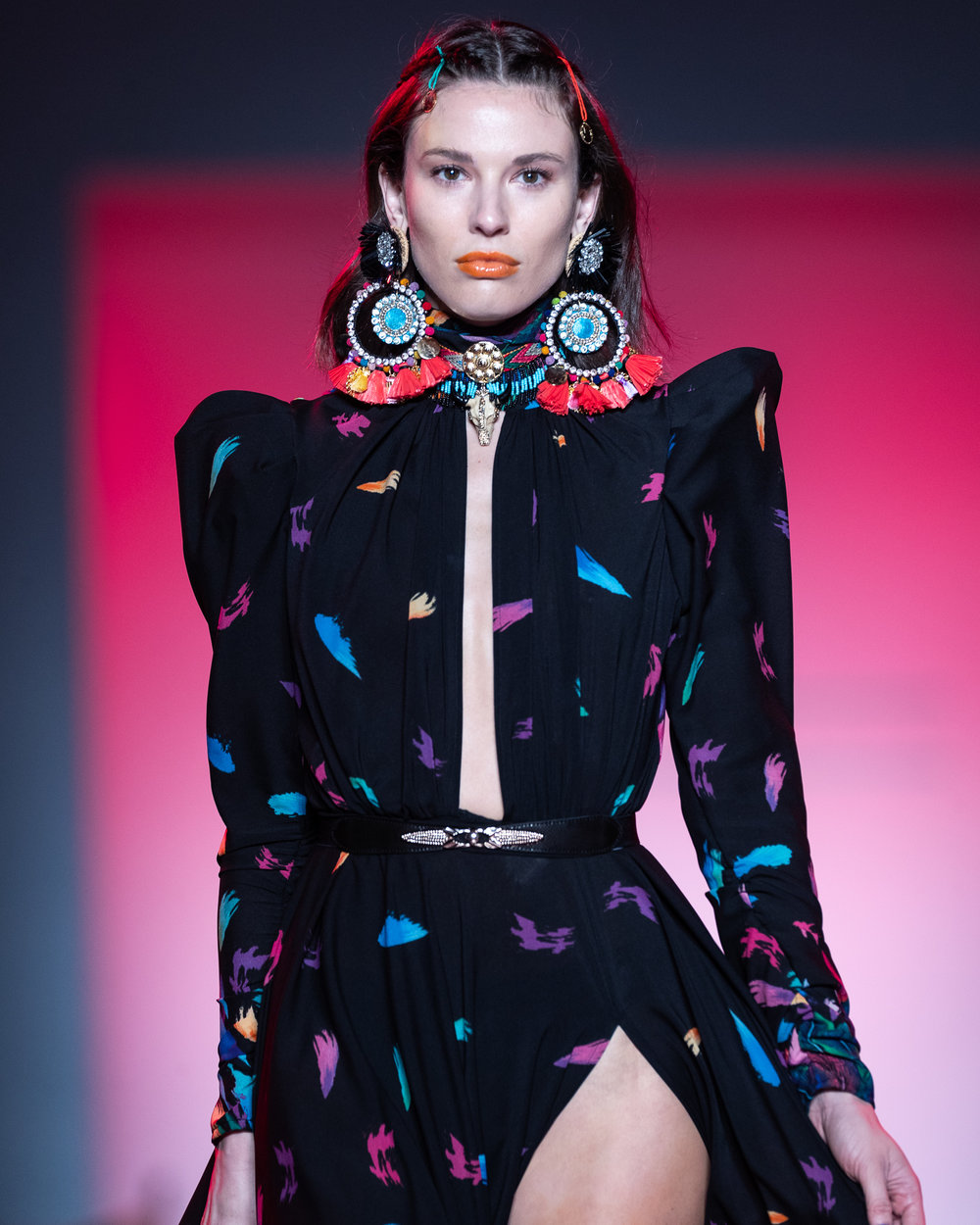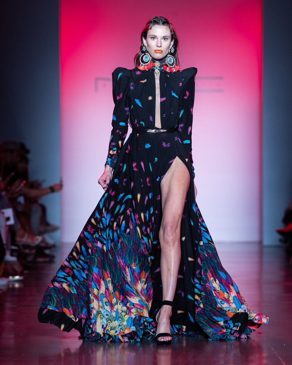 Last year Cardi B wore a feathered printed floor length dress with a high slit by Michael Costello The dress itself is black and the cool yet bold colors of the print consisted of purple, blues and pinks. It’s long sleeved with a plunging key hole neckline and padded shoulders. It was worn with a large brim patterned hat and she was styled by Kollin Carter.