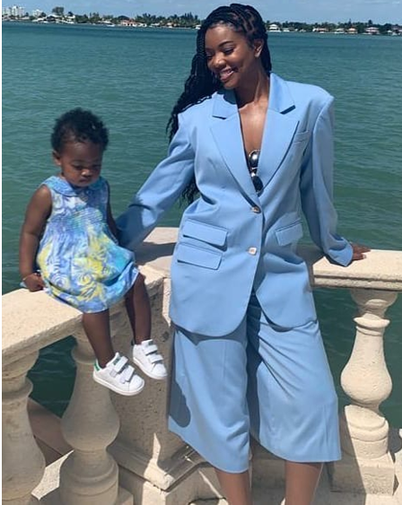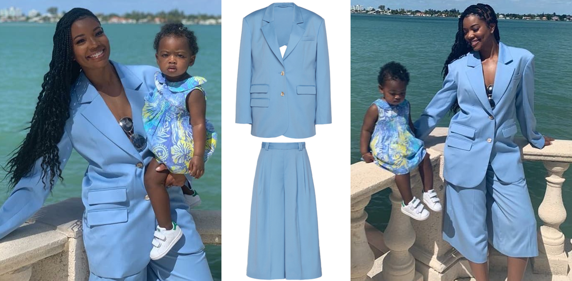 Celebrity Style Get the Look: Gabrielle Union Wade poses with Adorable Daughter Kaavia in a Blue Aje Short Suit Posted by Posted on Feb 24, 2020 showMessage = false, 2000)" > Copied to clipboard! Gabrielle Union Wade and daughter Kaavia were visions in blue tones, with Mommy Gabby looked fly in a short suit by Aje: Her cut out blazer is $495, while her shorts are $295. Get her look here. Would you splurge? Images: Gabrielle Union/Aje