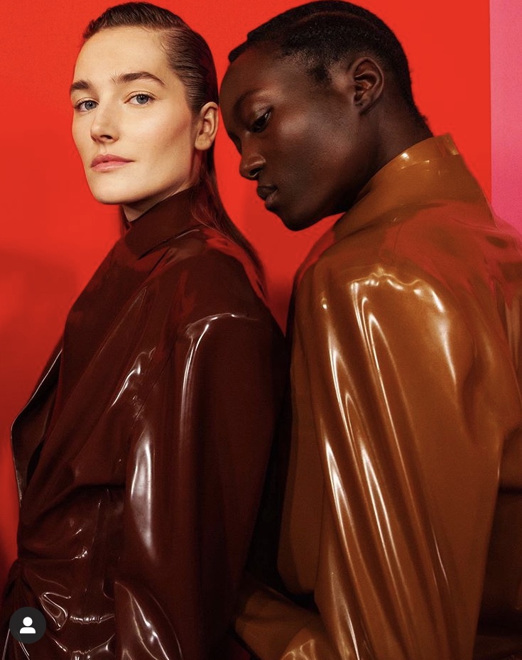 The latex fabric choice combined with with the colors create a “liquid” texture and gathered material in the front of the jacket accents her hour glass figure. She also wore different colors during Paris Fashion Week, mauve and caramel, in addition to the brown.