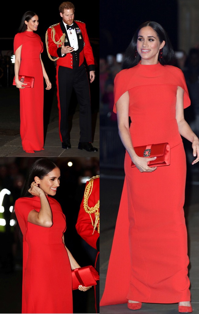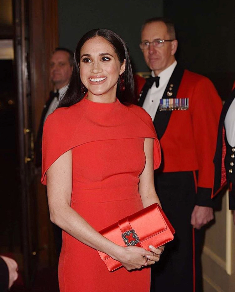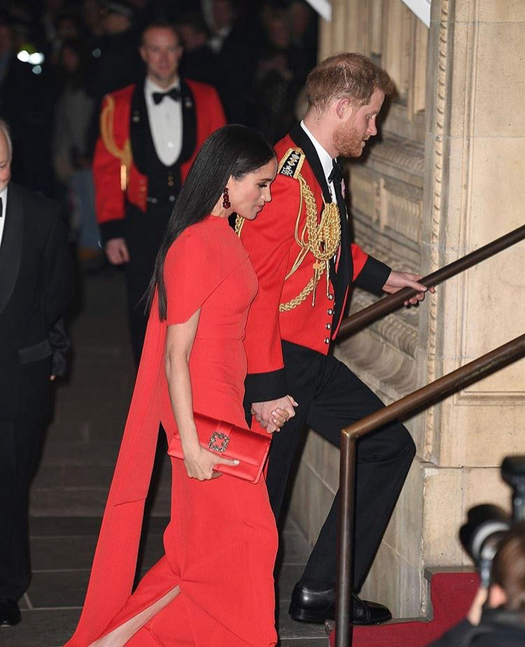 Even though the prestigious couple recently announced in January they would be stepping down from their esteemed duties, they always will be royalty to their fans supporters. The lovely Dutchess of Sussex, wore a beautiful caped gown by designer Safiyaa. Her long, dark and strikingly straight hair magnified her glowing complexion, along with her simple yet elegant blush toned make up. She chose Aquazzura pumps and a Manolo Blahnik clutch bag all in a matching hue of red, polishing her look to royal perfection.