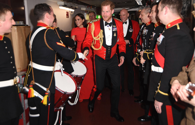 Prince Harry’s look was just as impressive. As Captain General of the Royal Marines, He wore a military style black and red tuxedo inspired jacket, respectively, and in uniform with his peers, adoring his military regalia. Harry looked very distinguished and like a true “officer and a gentleman” in dark tuxedo pants with bold red stripes and shiny military dress shoes. Once the famous couple’s royal exit is finalized, Harry plans to become Major, Lieutenant Commander and Squadron Leader during a trial period of 12 months.