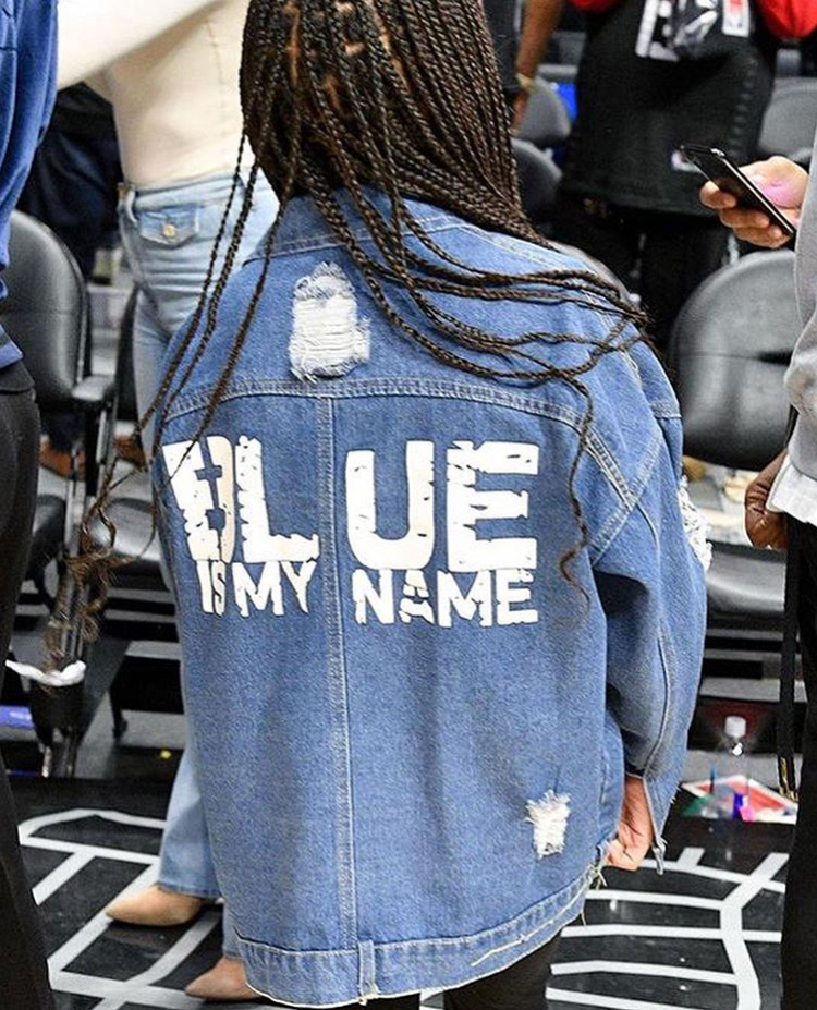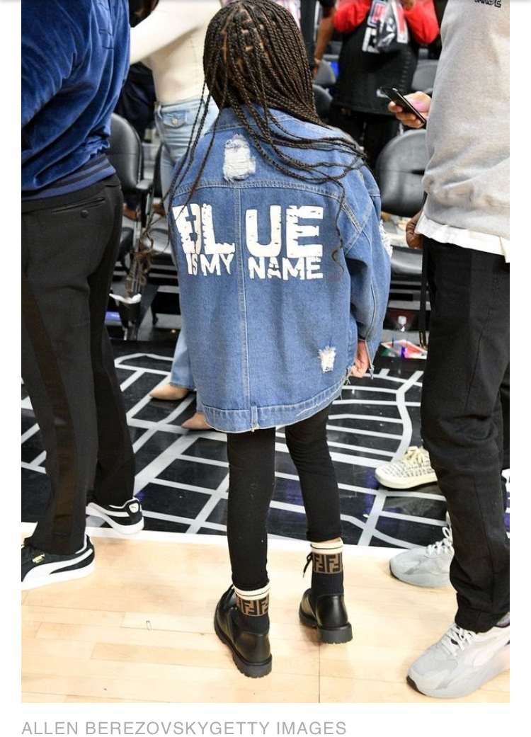 Social media is buzzing about the trendy mini “Queen” (just like her famous momma) and her fabulous, fun fashion. Blue wore simple black leggings with an oversized graphic gray T-shirt, topped off by a denim jacket that said “Blue is My Name” and $891 Fendi Boots, styled by Manuel A. Mendez.
