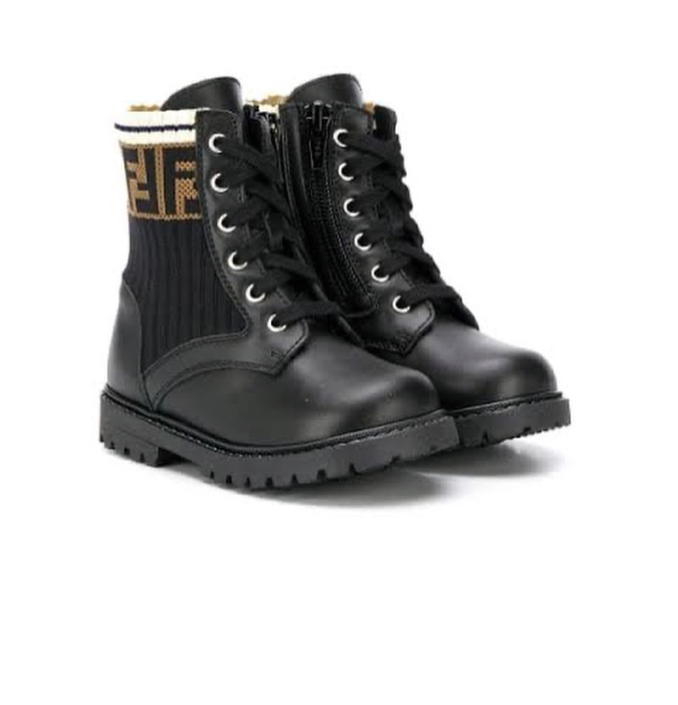 Her black monogram Fendi sock-style, lug-soled combat boots have a rounded toe and black laces. Catch them for $891 on Farfetch.com.