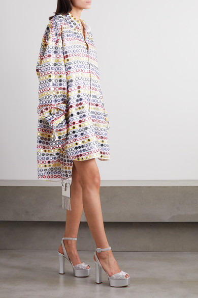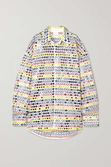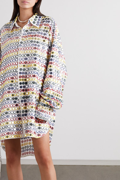 The piece is cut from white cotton-poplin and decorated with rows of brightly colored embroidery and glistening paillettes. The elongated silhouette means you can wear it as a mini dress, too.
