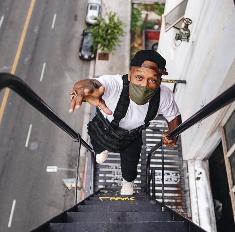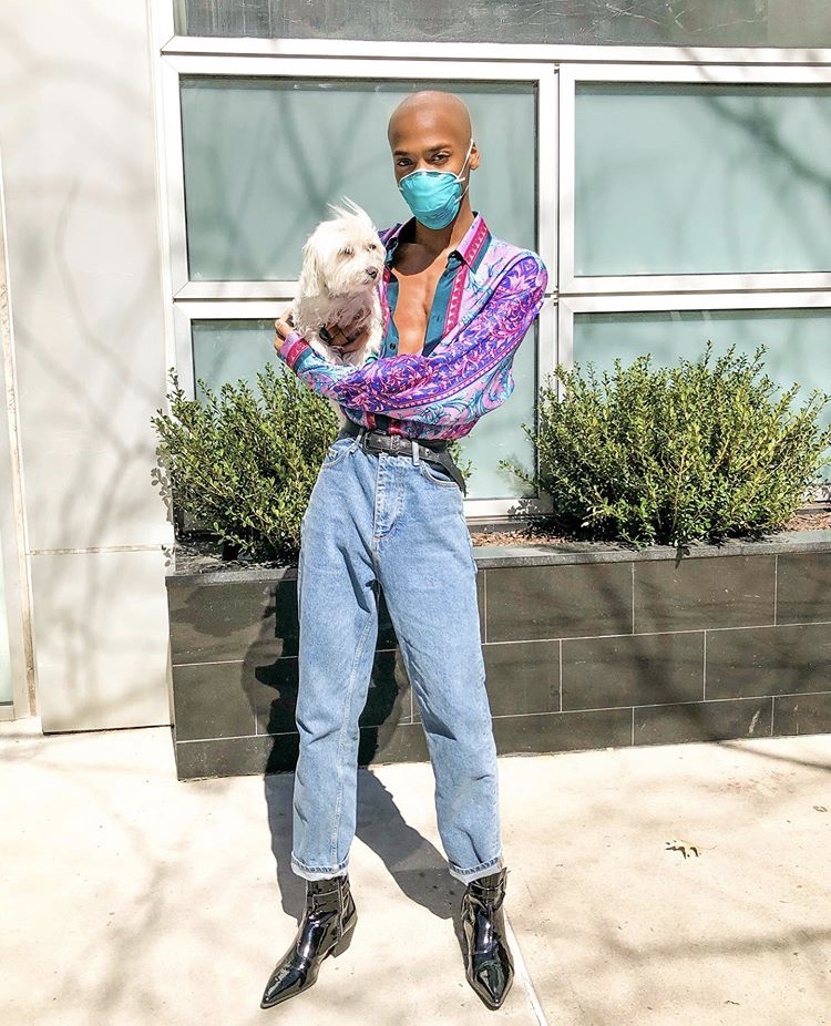 Brandon St. Regis writes, “I was given a mask by a medical professional who wants me to stay safe while living in NYC. Cases of COVID10 have doubled daily & staying home is the only option, but I have a dog that needs to be walked, so while I do that, I throw on a cute fit (to make myself feel good) and put on my mask.” Sounds good!