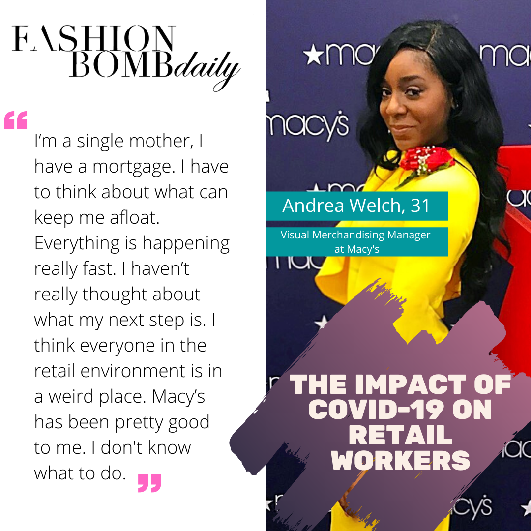 “I’m a single mother, I have a mortgage. I have to think about what can keep me afloat. Everything is happening really fast. I haven’t really thought about what my next step is. I’m on unemployment right now. My mortgage is being deferred. I think everyone in the retail environment is in a weird place. Macy’s has been pretty good to me. I don’t know what to do.”