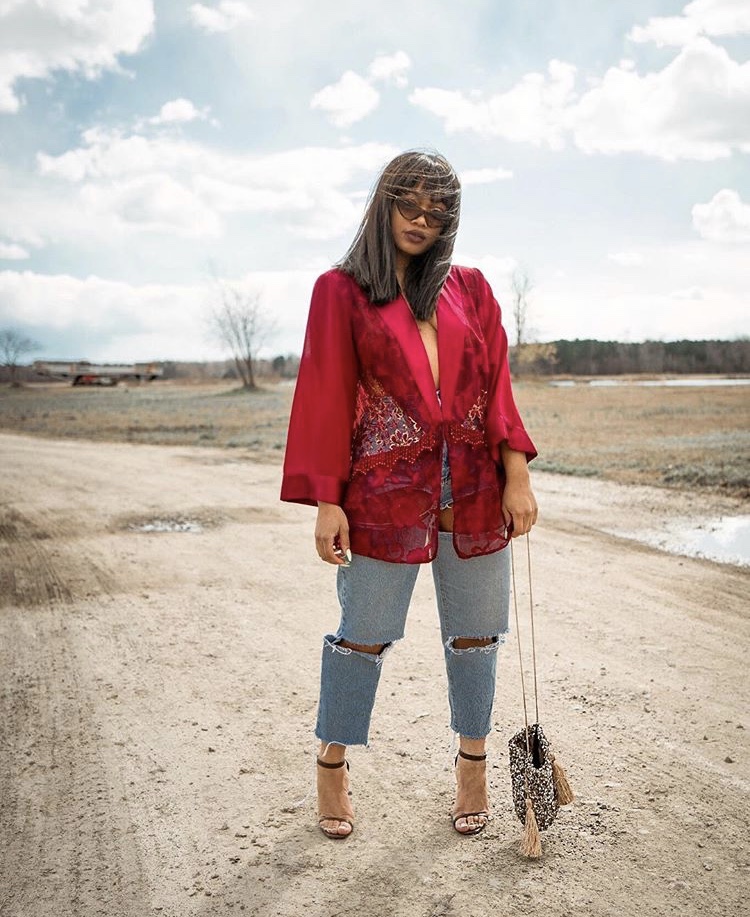 Iesha writes, “When it comes to my style, I like to call it vintage dramatic since 80% of my wardrobe is thrift-ed. I love pairing rare thrift finds whether it be sequins or high shoulder blazers with grungy bottoms.”