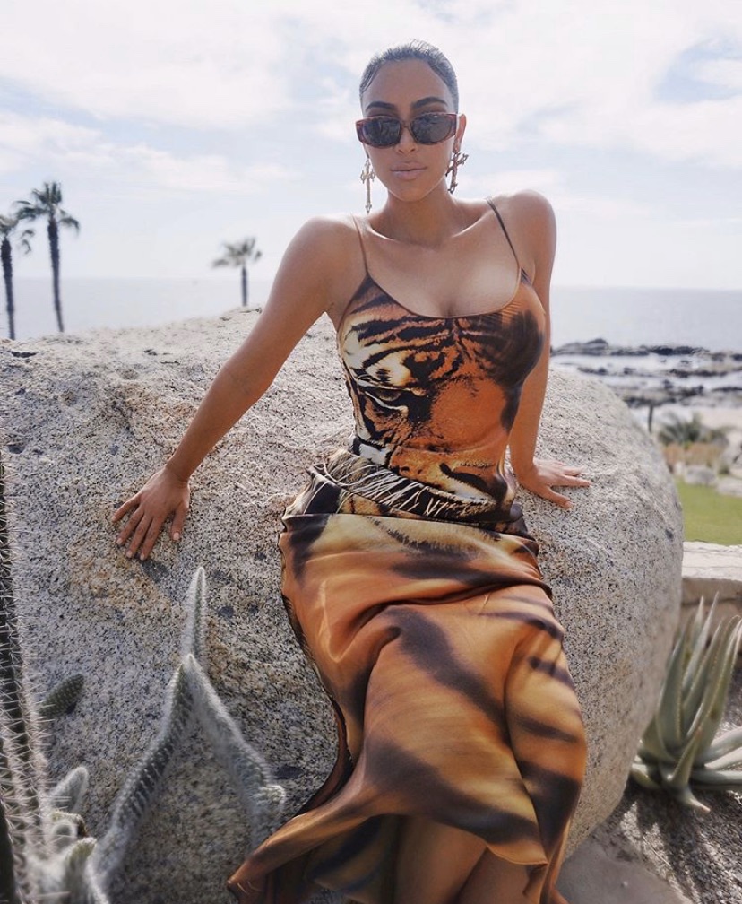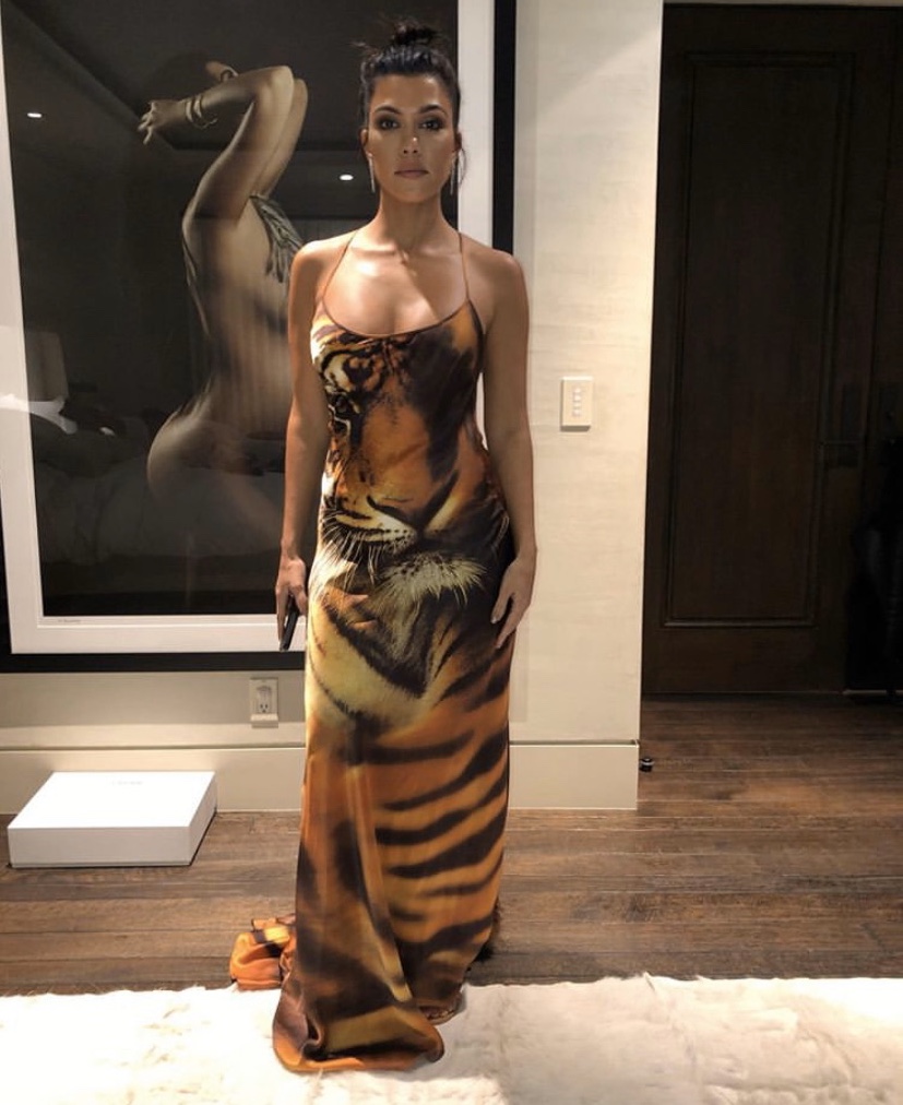 Two sisters, one bomb dress: who wore it best? It’s no secret that sometimes sisters share clothes! Kim and Kourtney Kardashian did just that with an Fall/Winter 2000-2001 Tiger Print dress by Roberto Cavalli. While Kim debuted hers in January with shades and cross shaped dangling earrings, Kourtney skewed simple in a top bun and minimal accessories.