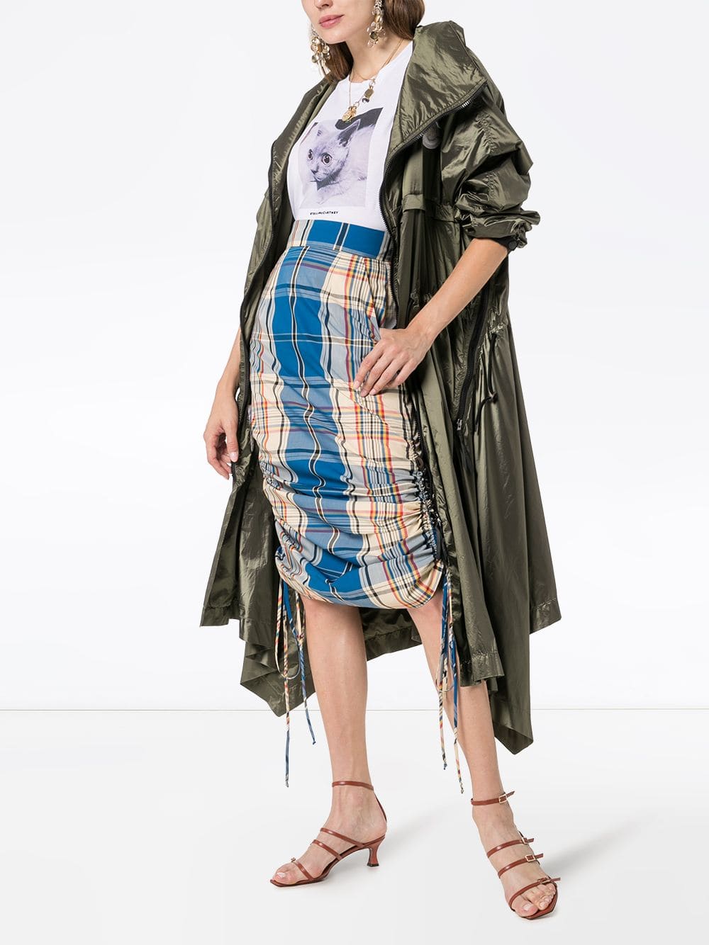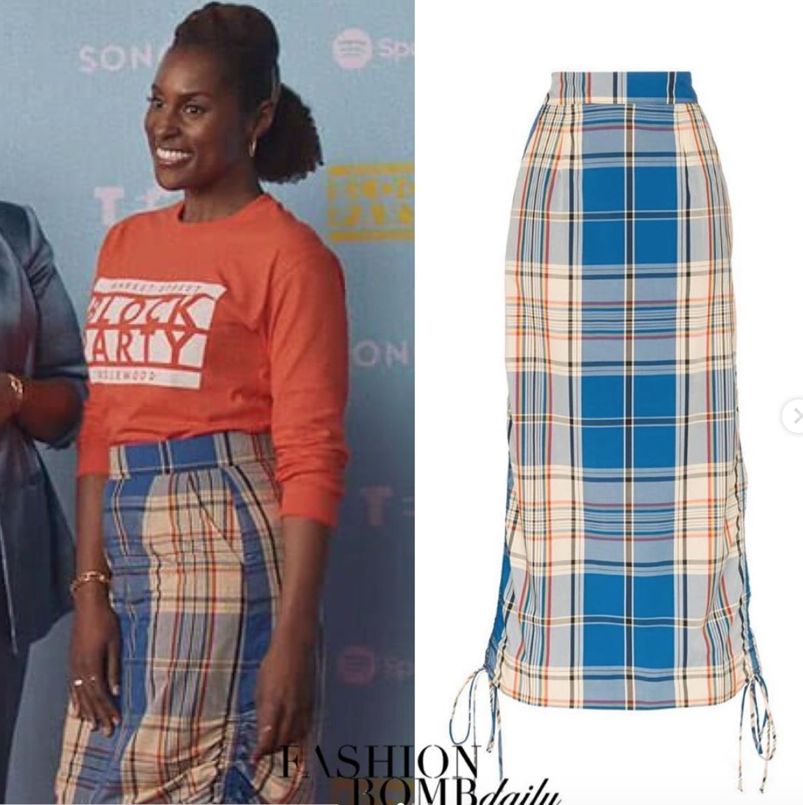 Issa Dee presided over the Block Party proceedings in a Block Party tee and a $350 plaid drawstring skirt by Simon Miller. Get yours at FarFetch.com.