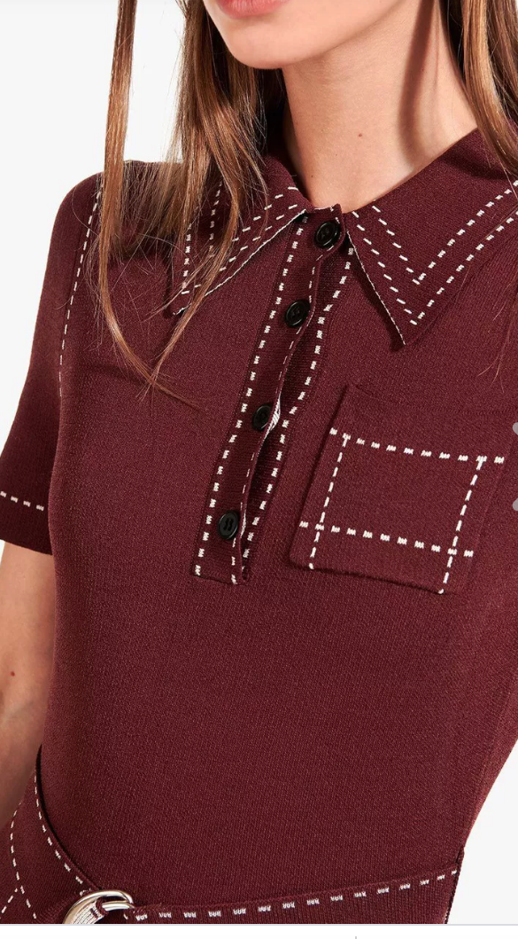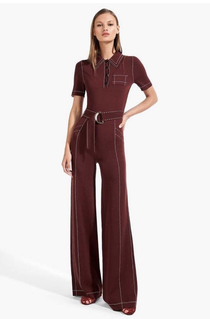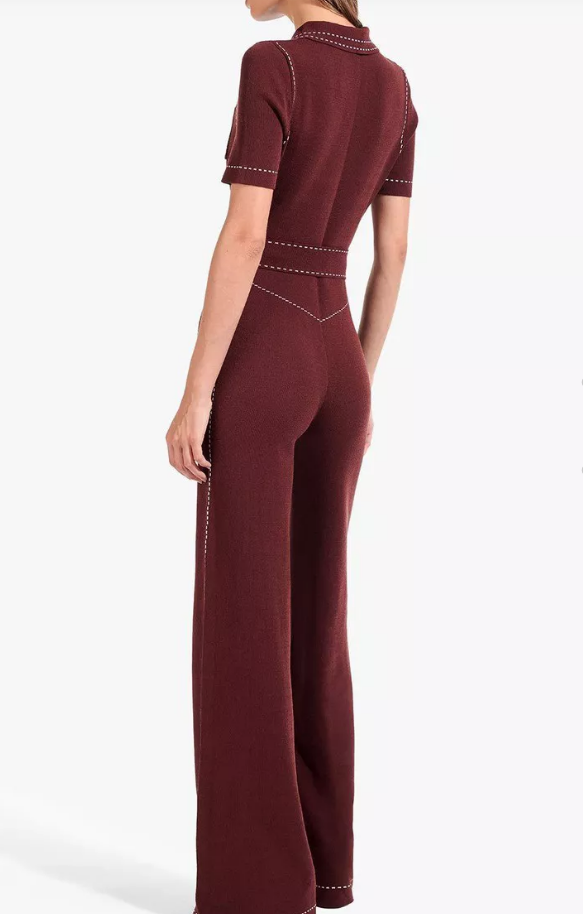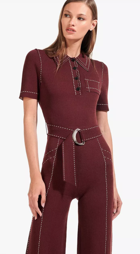 Her Burgundy one piece with contrast top stitching is by Staud.