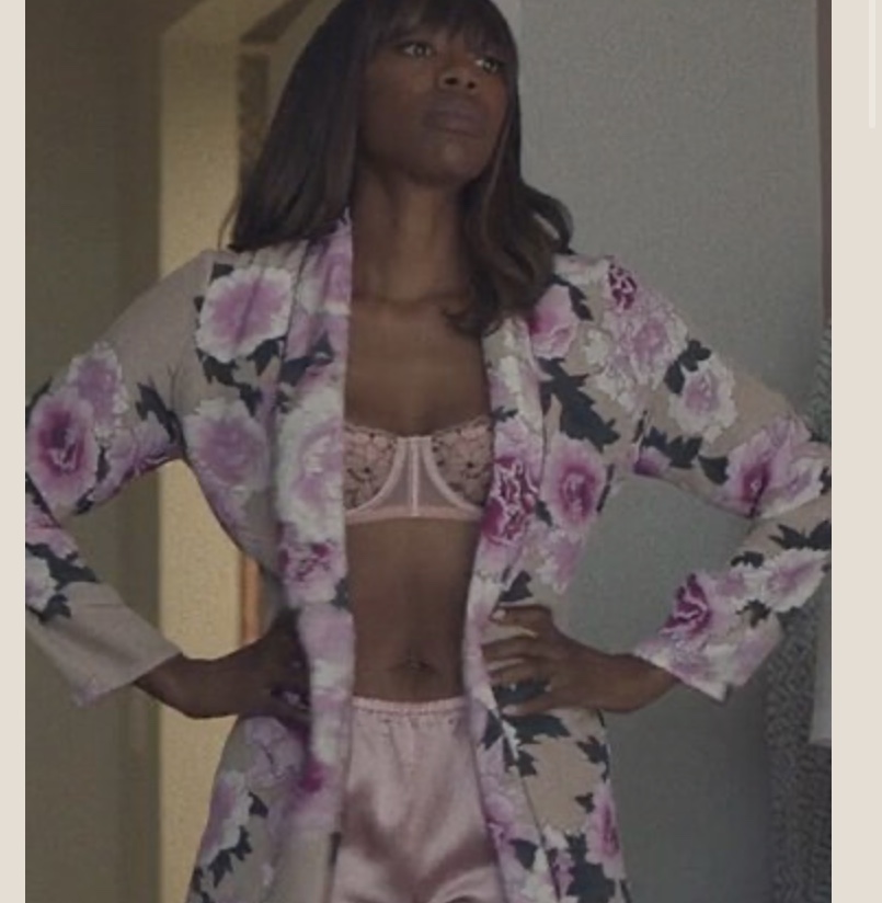 Yvonne Orji contemplates outfit options in a full Fleur du Mal look, including a $495 floral robe by the brand.