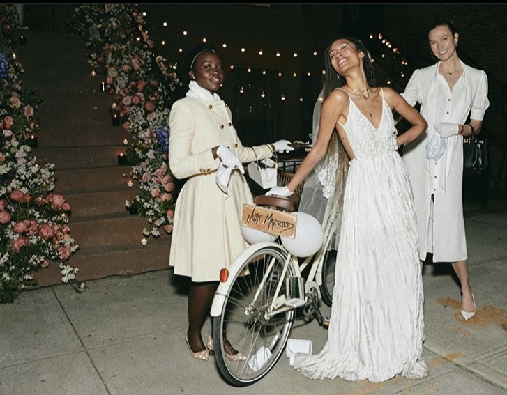 Those who were in attendance, including actress Lupita Nyongo and fashion model Karlie Kloss, wore white along side the bride and groom. Elaine wore a backless, spaghetti strap dress with a hip length veil. The dress was light and flowy and she paired it with white gloves.
