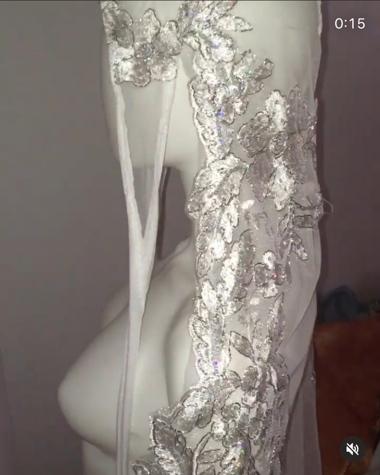 Vashtie wore all white but it was far from a traditional gown. She rocked a white tshirt, white pants by Dickie and all white Air Force1 tennis shoes but the show stopper was a custom floor length durag by Evita Loca. This durag flowed elegantly behind Vashtie and was embellished with jewels and floral detailing. She also wore a pair of long white satin gloves, which took the term “street-glam” to a whole new level.
