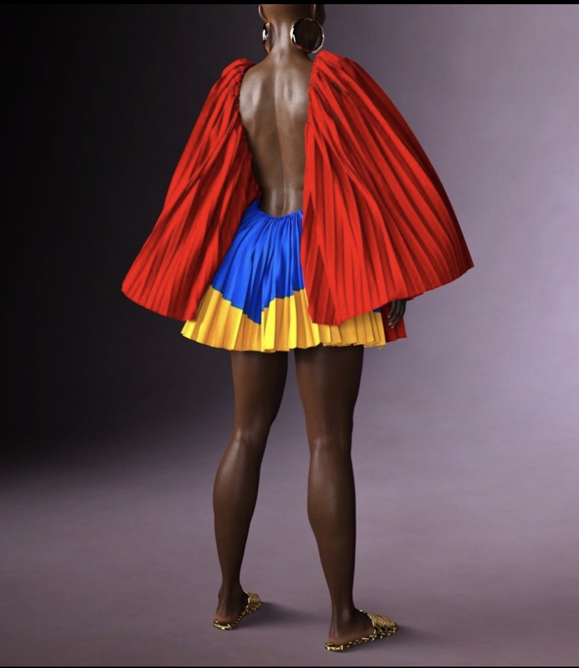 While most of the pieces were signature Hanifa fare: fantastically constructed bodycon dress and jumpsuits, pleated dresses, and ruched separates in a subdued color palette of white and blue, Mvuemba also incorporated colors of the Congo flag: red, which symbolizes pain, blue, which illustrates peace, and yellow, which stands for hope.