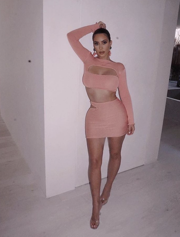 Kim Kardashian recently took a few snapshots at home wearing a knit set by JBD Apparel: