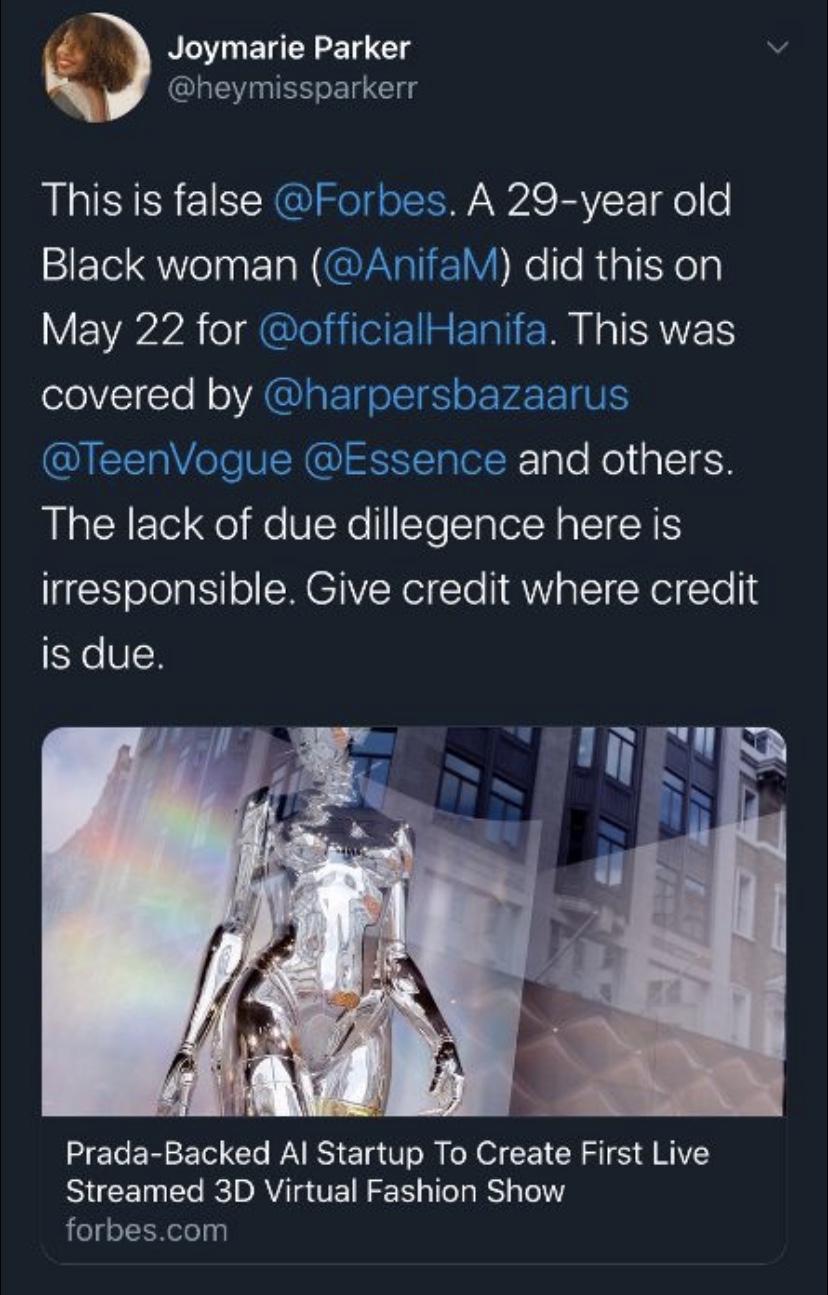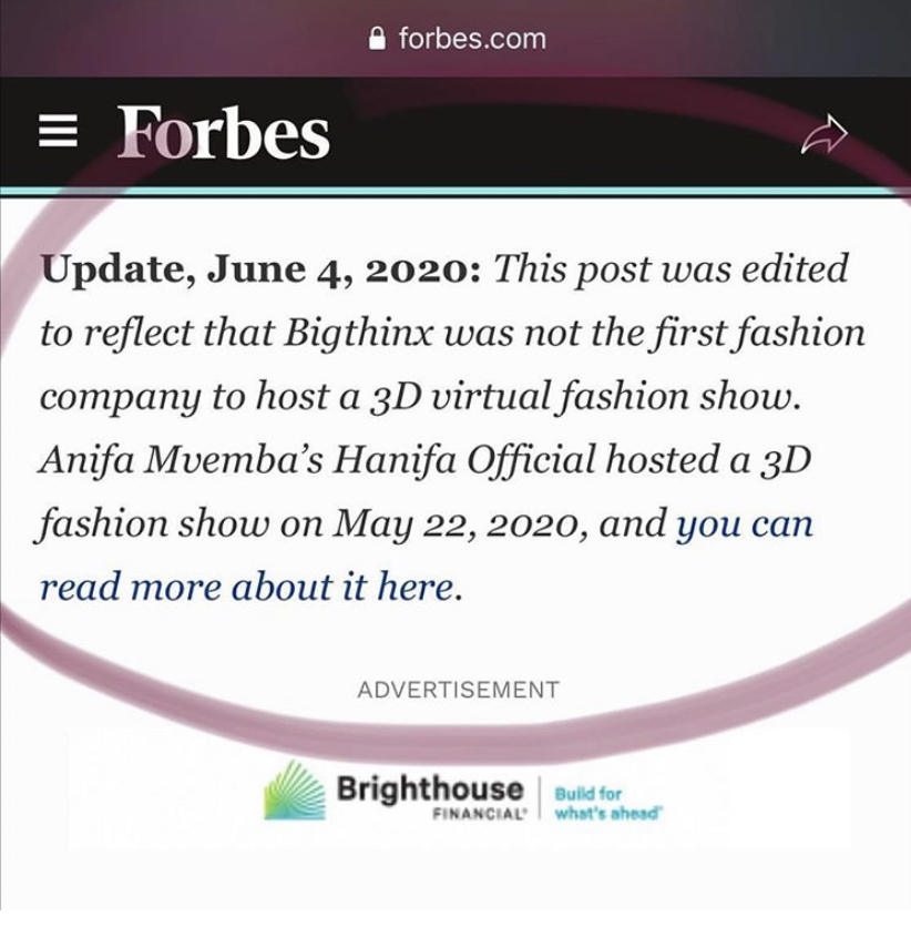 *A few hours after this post published, Forbes updated their article to include Hanifa’s show: