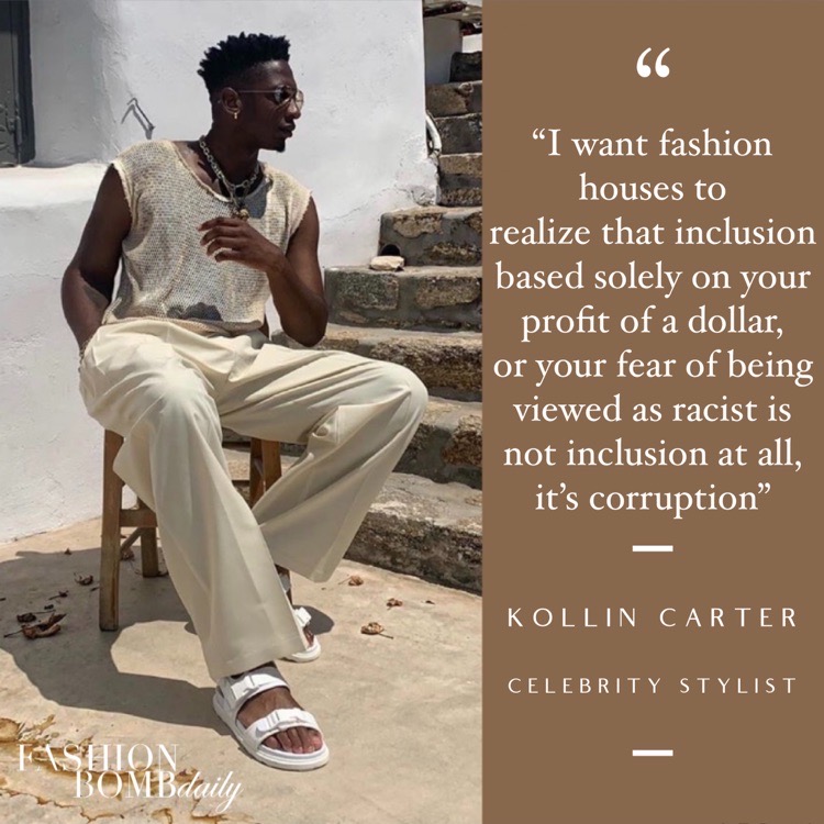 Kollin Carter, stylist to Cardi B, Normani, and Sofia Richie offers, “I want fashion houses to realize that inclusion based solely on your profit of a dollar or your fear of being viewed as racist is not inclusion at all, it’s corruption”